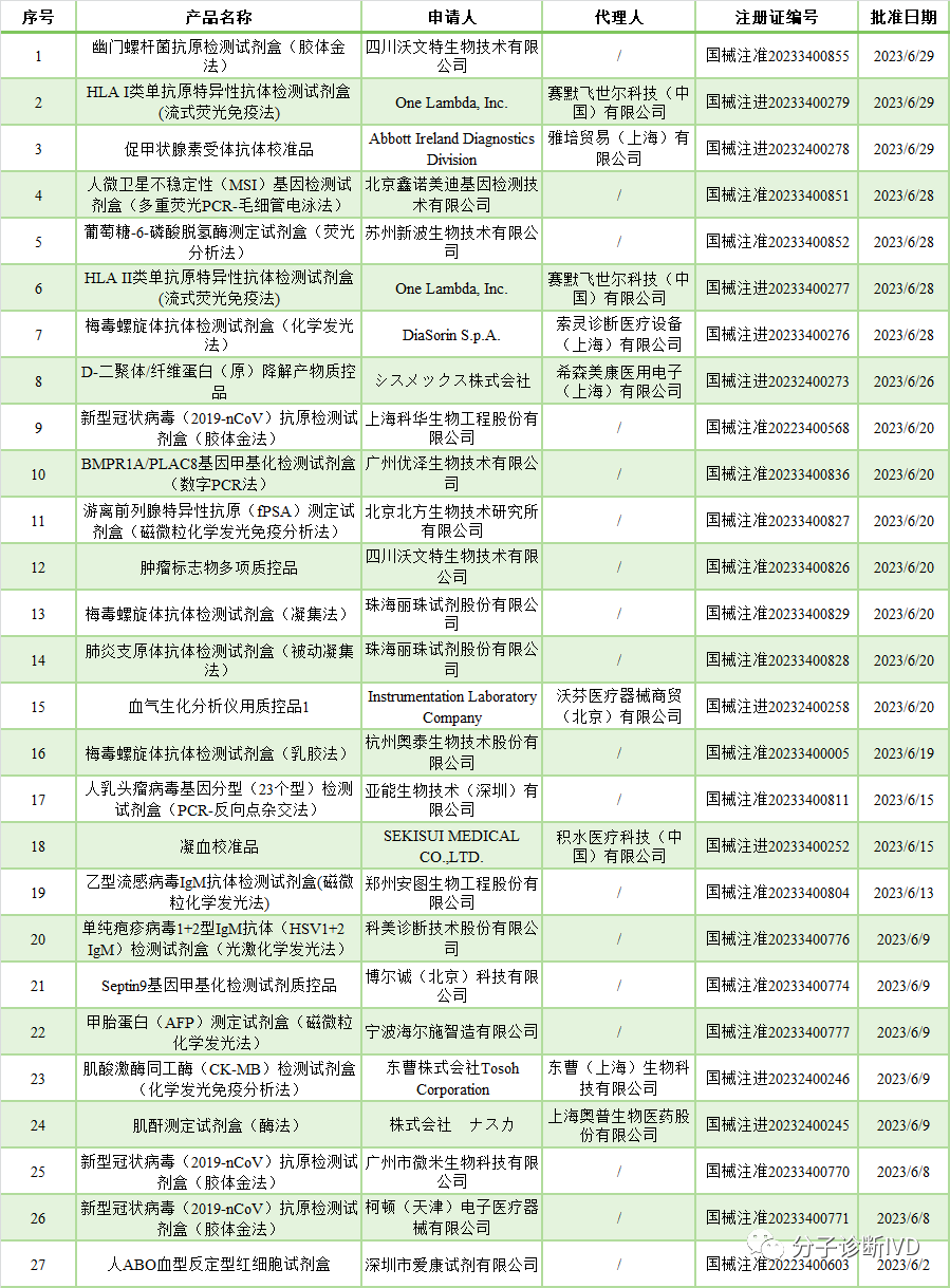 2023年6月,国家药监局共批准注册体外诊断试剂27个(不包括延续和变更注册)。其中,境内第三类体外诊断试剂18个,进口体外诊断试剂9个,详情如下: 6月国家药监局批准的体外诊断试剂名单 值得一提的是广州优泽生物技术有限公司的BMPR1A/PLAC8基因甲基化检测试剂盒(数字PCR法)于06月20日获国家药监局批准,该产品是国内第二款数字PCR试剂盒,也是全球首个数字PCR肝癌甲基化检测试剂盒。 另外,6月21日,凯普高危型人乳头瘤病毒核酸检测试剂盒(荧光PCR法)取得国家药监局批准的医疗器械变更注册(备案)文件,增加宫颈癌初筛、宫颈癌联合筛查和ASC-US人群分流预期用途,本次预期用途的变更属于同品种首个产品首次申报,也是国家药监局批准的第一个用于宫颈癌筛查预期用途的产品。 正所谓几家欢乐几家愁。6月共有10款体外诊断试剂被终止注册审查或不予注册,其中包括2款新冠检测试剂盒,3款病原体多联检试剂盒。 6月国家药监局终止注册或不予注册名单 新冠应急审批医疗器械注册证有效期是一年,部分应急审批器械是附条件上市的,上市后要继续完善申报资料,特别是临床研究等,必须在一年有效期内完成。由于市场消退,部分试剂生产企业已丧失了延续注册的动力,终止注册审查也在情理之中。 近年来,受新冠影响,病原体多联检逐渐热了起来,多家IVD企业入局。比较有代表性的有:圣湘生物六项呼吸道病原体核酸检测试剂盒,宁波海尔施生物13种呼吸道病原体多重检测试剂盒,凯普生物生殖道感染病原体核酸检测试剂盒,伯杰医疗六项呼吸道病毒核酸检测试剂盒,北京卓诚惠生呼吸道病毒核酸六重联检试剂盒等。 从技术上说病原体多联检的实现并不困难,真正限制病原体多联检产品转化落地的是临床试验这个节点。不论你是几联检,只要你进行注册申报,临床研究对于每一种检测范围内的病原体均要求有足够的阳性样本例数。而临床实践中,某些病原体在某些地区和季节并不是优势种群,临床阳性样本获取难。因此,临床试验也成为了“卡脖子”的关键。 临床试验专业性强,对人员要求高,是发补的“重灾区”。根据2022年上海市第二类体外诊断试剂常见发补问题统计,首次注册产品临床评价资料发补率高达61.19%。而第三类体外诊断试剂临床试验要求更高,其发补率只高不低。临床评价资料常见问题有以下几类: 临床方案或报告方面:临床方案版本升版,但没有记录不同版本内容的差异;临床方案或报告未盖章,或缺少申办方或临床试验机构签章;不同临床试验机构临床方案不一致。 临床样本方面:缺少样本背景信息;样本保存条件与产品说明书声称条件不一致;样本预处理方法与产品说明书声称条件不一致;未提供样本抗凝剂信息;阳性样本例数不足;受试者重复入组等。 对比试剂的选择方面:未对比对试剂的基本原理、性能指标、阳性判断值、参考区间等进行比对分析;未充分考虑可比性、方法学、预期用途、参考区间、性能指标、样本类型等因素,如对比试剂线性范围不能覆盖考核试剂、比对试剂与待评价为不同方法学,且未给出解释;未提供对比试剂说明书,或提供的说明书不清晰、不完整。 统计分析方面:未对入组人群进行年龄分布统计;未进行分组统计分析;统计分析方法选择错误;统计指标选择不合理;揭盲后样本检测结果纳入统计分析;只进行了统计指标的点估计,未进行区间估计;未提供待评价试剂与对比试剂医学决定水平处的偏倚评价分析,未对离群值进行合理分析等。 临床试验设计:入组人群与产品预期人群不符;没有纳入干扰样本;对比方法选择不合理等。 临床试验犹如科目三,不仅要求能驾驶车辆从起点开到终点,还要求整个过程中没有致命的扣分项。临床试验每走一步均需严格按照临床法规、指导原则、临床试验方案和临床SOP相应要求执行,最忌恣意妄为。临床试验需要申办方、研究者和受试者密切配合,缺一不可。