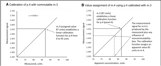 在计量上可溯源的校准等级中 哪个校准品必须与临床样品是可互换的 使用不同终端用户的体外诊断设施(IVD-MD)检测临床样品中相同被测量具有等同结果,是为诊断、治疗、监视、或风险评估是必须的。ISO 17511:2020规定了如何建立计量溯源性到较高等级可用的参考系统成分,使得在IVD-MD间有等同的结果。与临床样品(CS)互换性是参考物质在校准等级中作为一个校准品的必须特性。但是,在校准等级中不是所有校准品被要求是可互换的;不同校准等级对哪个校准品必须与CS具有可互换具有不同的要求。因为互换性的评估是一个艰巨的努力,所以,重要的是,在实施某个校准等级时,确定哪些校准品需要可互换的。我们提供了一个指导,在纠正任何不可互换的偏移是适当下,哪些校准品必须与CS是可互换的;以及在ISO 17511:2020中,叙述的各个类型校准等级中,没有要求校准品与CS的互换性。 背景 使用不同终端用户的体外诊断设施(IVD-MD)检测临床样品中相同被测量具有等同结果,是为诊断、治疗、监视、或风险评估是必须的。ISO 17511:2020规定了如何建立计量溯源性到较高等级可用的参考系统成分,使得在IVD-MD间有等同的结果(1)。计量溯源性是通过系列校准步骤的一个不间断链,从可用的最高参考物质(RM)和/或参考检测程序(RMP),到临床样品(CS)的最后结果。一个IVD-MD的最合适的计量溯源性是SI制单位,其中计量溯源性被校准等级确定,开始于较高等级RN或RMP,依从了各自ISO 15194(2)或15193(3)标准。 计量溯源性到较高等级的参考系统组分。使得在不同时间和地点,和不同终端用户IVD-MD间得到一致的校准等级。ISO 17511:2020叙述了校准等级的示例,说明溯源性到SI和较高等级的参考系统组分是可能的,其他情况仅为可用的技术方式,是校准等级没有包括较高等级RM和/或检测程序(MP),作为厂商选定的指定RM(1)。 ISO 17511:2020在多个地方提示了RM互换性和校准品可应用在给定校准等级处的重要性。但是,没有提供明确的指导,在一个等级内的特定校准品,必须与CS是可互换的,或互换性不是必须的。一个校准品未被检出的不可互换性,会引起某个MP具有偏移。因为评估互换性是一个很艰巨的努力,很重要的是确定,在实施IVD-MD的校准等级中,哪个校准品需要与CS是可互换的。 国际计量学词汇定义参考物质的互换性:对于给定物质的规定量,由两个给定测量程序(MP)得到的测量结果间关系,与其他指定物质测量结果间关系一致程度表示的参考物质(RM)的特性(4)。在检验医学,“其他指定物质”是临床样品(CS)。互换性可以定义为:更有功能的叙述,为某个RM的特性,以两个或更多的检测系统检测,对RM的检测响应,与含有相同规定被测量的量临床样品是相同的。 在合适相应下,某个RM的互换性可以按照文献的技术叙述予以评估(5-7)。一个溶液的基质包括所有除了分析物外的所有分子和离子。在校准物质的基质,与CS的基质有足够差异下,将偏移引入某个MP的校准等级,引起了不可互换性。在相应环境下,不可互换性的偏移可以在添加某个纠正步骤到校准等级中去除(8)。 本报告中,在ISO 17511:2020中叙述的一些校准等级通用模式中,我们提供了指导,就某个校准等级中哪些校准品,必须与CS是可互换的,何时对不可互换性的偏移的纠正是合适的,何时一个校准品的互换性不是要求的。因为在ISO 17511:2020展现的校准等级模式,会应用在被不同IVD厂商各个不同配置到适应可用的RM和MP,这里给出的示例,代表了特定的实施,去展现逻辑被应用去确定,是否在某个特定校准等级中对校准品要求互换性。展现的概念也可被应用到需要的校准等级的各个其他需要的基质等级的配置。 在要求和不要求校准品的换性的指导和示例 在图1、2和3中,展现的校准等级中的每个步骤,按照ISO 17511:2020确定的习俗标记缩略号。这些缩略号确定了检测程序的标准等级水平(指定为p.1到p.6),和校准物质(设定为m.1到m.6)在确定的校准等级内每个在水平处展开。对每一个这些标准词语以及详细解释,在计量上可溯源的校准等级内在ISO 17511:2020内给出相应缩略号,并总结在表1中。 一个 “完整”计量溯源性到SI,如在ISO 17511:2020,5.2内叙述的,被展现在图1A。被广泛接受的做法是,使用一组真实CS(m.3),将一个p.3 RMP的值转换到m.4和/或p.6终端用户IVD-MD,对于m.3 RM去用于临床实验室为CS(m.6)确定值。按照定义一组真实CS被接受为可互换的,以及被选定的CS组在制备和储存中没有变化,该组没有包括具有干扰物质或其他标本-特定的已知影响的CS,会不利地影响p.4 MP的性能,其中该组CS被用于进行校准(5)。作为p.5常设MP的校准品的功能,m.4厂商的应用校准品(一级批校准品),通常由IVD-MD厂商制备,应是稳定和可用许多年,去支持未来正在序列批的m.5终端用户IVD-MD校准品设定值(该校准品一年内有多批)。使用m.4应用校准品,替代了m.3一组CS。去校准p.5常设MP,为此节省了连续的、设定值、和保持CS组等的费用。 若可能,可要求替代一个有证参考物质(CRM),它与该组CS处于m.3位置的是可互换的,使得IVD-MD厂商在实施计量溯源性较早,并较少的费用。同于m.3位置的CRM,为二级CRM,有别于在m.1位置的一级(纯物质)CRM。二级m.3 CRM经常具有的基质类似于CS,促使与未改变的CS具有互换性。为该被测量的可互换的m.3 CRM,由国家计量研究院产生,预期被用于所有IVD厂商,作为它们各自的内部基质等级,去实现为CS在许