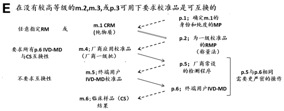 在计量上可溯源的校准等级中 哪个校准品必须与临床样品是可互换的 接上文 图3、(A)组为p.4是与p.5和p.6不同的MP(它们的每一个是相同IVD-MD的示例)下,校准品必须与临床样品是可互换的校准等级。(B)组为没有满足m.4互换性的要求下,将纠正不可互换性偏移的步骤添加到校准等级。步骤p.4a是纠正程序,应用在为m.4定值,去实现m.4a新的定值,再用于校准p.5。(C)组为加注的校准等级,说明校准品必须与临床样品是可互换的,m.3 CRM或CS组是最高等级参考系统的组分。(D)组为加注的校准等级,说明校准品必须与临床样品是可互换的,在p.4选定MP是不同厂商的终端用户IVD-MD,没有其他较高等级参考系统组分可用。(E)组为加注的校准等级,说明校准品必须与临床样品是可互换的,在较高等级纯物质CRM或含有被测量的指定RM,是添加了适当基质形成了m.4应用校准品,没有其他较高等级参考系统组分可用。(F)组为加注的校准等级,说明校准品必须与临床样品是可互换的,而一致性方案是可用的最高等级参考系统组分。所有符号和箭头参见图1。NC为不可互换性。 (注:上面的各个图,我也已经全部放大在下面翻译。冯) 左右滑动,查看更多 在p.4,p.5和p.6均为相同厂商生产的相同IVD-MD的情况 图1B展现了计量溯源性到某个m.1纯物质CRM,在校准等级中的RM必须与CS在MP情况下时可互换的。m.1 CRM是纯物质RM,它与互换性没有关系。为被测量的p.3 RMP的p.3 RMP的m.2 校准品,由m.1 CRM制备。对很好指定(设计)的p.3 RMP应用,经典地不需要与CS的互换性,在m.2的一级校准品基质和m.3 CRM基质二者具有高度的选择性。某个p.3 RMP的性能特性,应不受被检测样品的基质的影响,理想地,应依从ISO 15193的要求(见ISO 17511:2020, ),对者m.2中的被测量是高度选择的(1,3)。 在图1,B中,p.4厂商选定MP、p.5厂商常设MP、和p.6终端用户IVD-MD,是由厂商产生的相同IVD-MD的所有示例。在用于p.4和p.5角色中,IVD-MD典型地以对关键检测系统要素增加了重复检测,如校准品(如,在加到每一个重复检测中的不同瓶数或分样)、CS、和仪器(如,分析仪相同型号台数和/或版本),较按照在p.6终端用户IVD-MD使用说明的要多。使用这些更严密的操作条件,去减少为m.4和m.5校准品定值的检测不确定度。使用相同IVD-MD作为p.4、p.5、和p.6,是IVD-MD厂商的惯例。在这些情况下,在使用p.6的终端用户IVD-MD检测时,要求m,3 CRM与CS可互换,理想地,CRM预期被作为所有厂商IVD-MD的共同校准品。注意,在较早讨论的纠正可能性,若需要,某个特定终端用户IVD-MD,对CRM与CS不可互换的校准等级中,m.3中的不可互换性的偏移需要纠正(8)。 原则上,可互换的m.3 CRM可以用于直接校准所有厂商的p.6终端用户IVD-MD,直接供应m3 CRM给所有终端用户临床实验室,成本太高。而且不实际。因此,IVD-MD厂商典型地制备了m.4应用(一级批)校准品和m.5 终端用户校准品,将可互换的m.3 CRM的值转换给医学实验室检测的m.6 CS结果,只要使用厂商的p.6 终端用户IVD-MD。m.4“一级批”的批量较小,被预期可储存和可用许多年,厂商去校准p.5,被用于为m.5终端用户校准品成功批号定值,通常可以制备较大批量销售给终端用户。依据生产要求,不同批号m.5可以每年制备数批 成为终端用户校准品提供给医学实验室。 m.4和m.5 IVD-MD厂商特定校准品的基质,可以只要适合目的即可,使用IVD-MD厂商的p.6 IVD-MD,将可互换的m.3 CRM(用于所有IVD-MD厂商的共同校准品)的值,转换到m.6 的CS。m.4和m.5校准品没有必须以相同基质制备,也不用于CS具有相同基质,因为它们仅用于特定厂商的IVD-MD。m.4和m.5校准品可以使用纯化化学物,作为初始材料制备(如在缓冲的牛白蛋白溶液或一个水溶液中的分析物)为提供renewable可更新的物质,适合涉及p.4,p.5,和p.6技术的检测。以纯化的化学物制备的m.4和m.5校准品,可产生非常可再现的批间产品,在校准等级的p.4,p.5和p.6位置使用IVD-MD检测,将具有非常一致和可预期的性能。 图2展现了,为什么m.4厂商的应用校准品和m.5 终端用户IVD-MD的校准品,不需要于CS可互换,这是使用的相同IVD-MD作为p.4厂商的选定MP、p.5厂商厂商MP、和p.6终端用户IVD-MD的例子。很重要的要认识,m.4和m,5被预期仅用在为规定的终端用户IVD-MD校准等级;它们没有预期用在任何其他IVD-MD的校准等级。在这些示例中,使用线性校准函数展现和逻辑可推广到非线性连续响应校准函数。在等级中从某个RM值转换到下一个的序列,和为什么一个可互换RM不需要在图2的所有步骤中,叙述如下: 1、 图2A,可互换m.3 CRM(设定值87单位),使用MP p.4具有的检测信号1.560,为p.4建立了线性校准函数,从0到95单位。 2、 图2B,物质m.4,厂商一级批校准品,使用MP p.4的信号1.483。产生的检测信号是由被测量加上与基质有关的不可互换偏移影响。因此,校准函数对m.4设定了值83单位,反映了被测量浓度受到任何不可互换性的偏移影响,具有了受影响的检测信号。任何不可互换性偏移的大小,在为m.4设定值上没有关联,纠正了不可互换性偏移被测量实际值也没有关联。 3、 图2C,物质m.4(设定值83单位),使用MP p.5具有的检测信号1.505,建立了p.5的校准函数。p.5的校准函数的斜率不同于p.4校准函数的斜率,因为这是相同IVD-MDp.4和p.5的不同例子。但是,因为p.4和p.5是相同的IVD-MD,它们受到实际上存在于m.4内任何不可互换性偏移的影响程度是相同的。因此,p.5的校准函数(以m.4校准)正确地反映了从可互换m.3转换到m.4,p.5的线性校准函