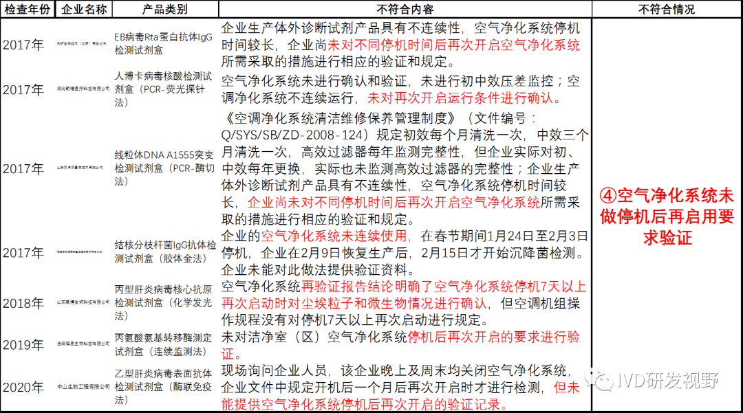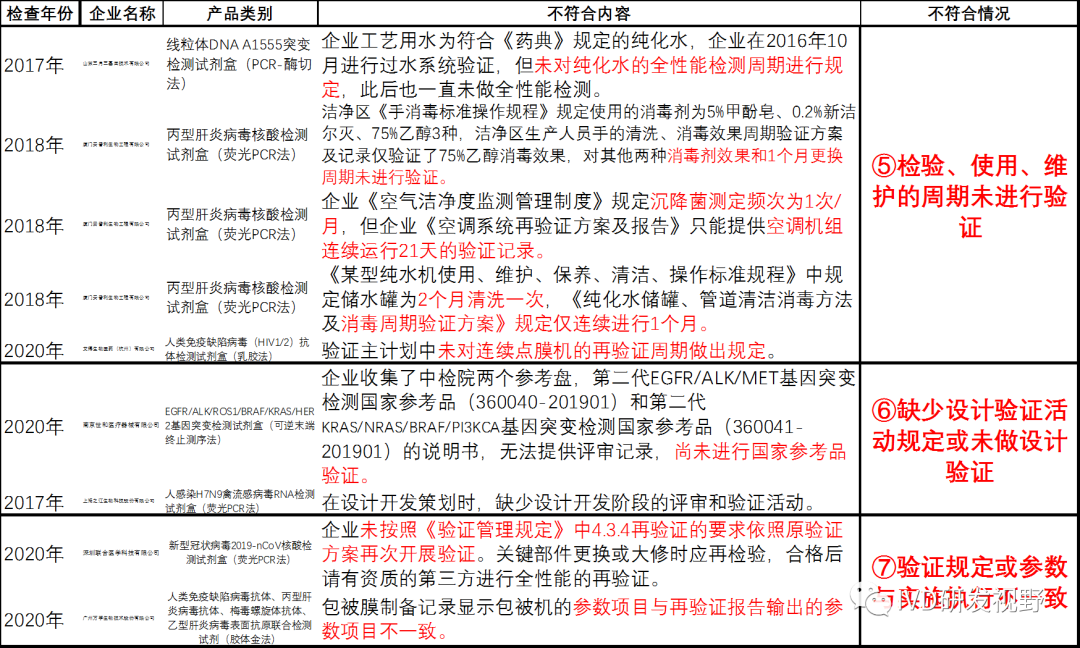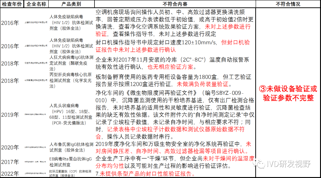 仅统计2016-2023历年飞行检查IVD企业中关于验证的不符合项,如果是无菌和植入器械,关于验证的缺陷项会更多,所有产品类别验证相关不符合项达到367条。按医疗器械GMP的章节进行统计分析,可以看出不符合项主要集中在设备、生产管理、设计开发章节。 按验证不符合的情况进行统计分析,可以看出不符合项主要集中在未做物料有效期验证、清洁消毒验证、设备验证方面。 以下是上述不符合项的具体内容。①原料、中间品等有效期未做验证。