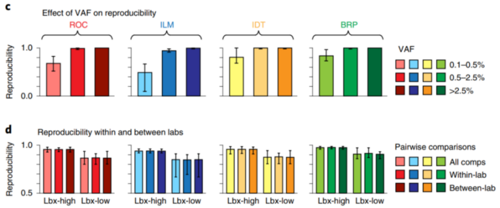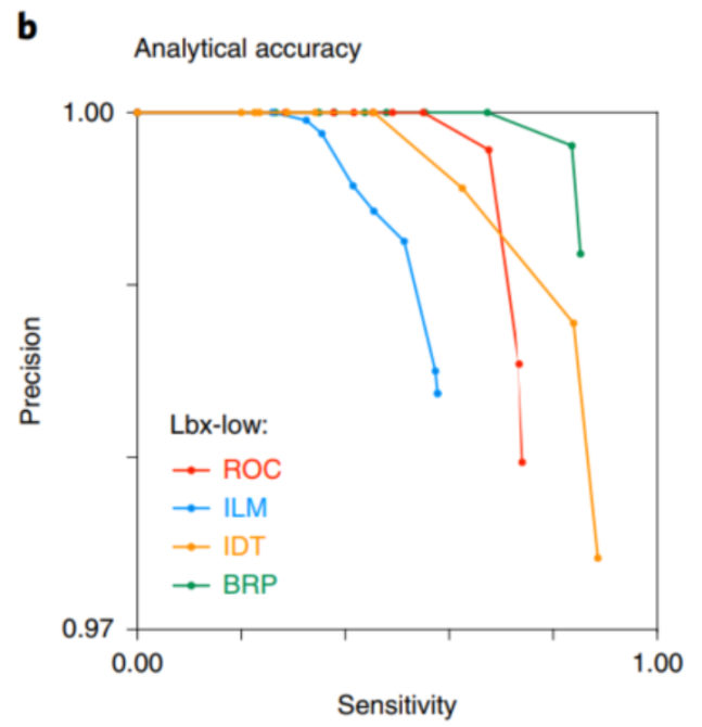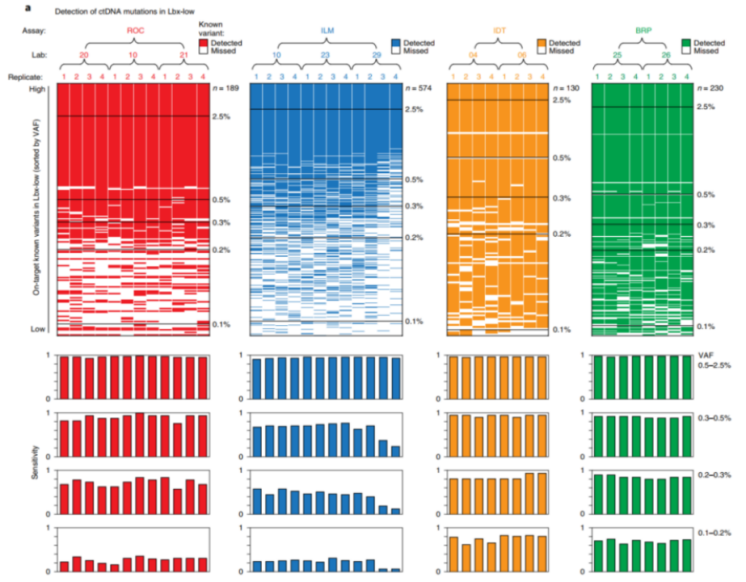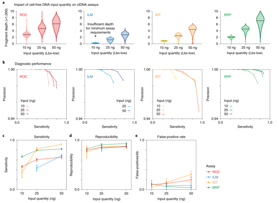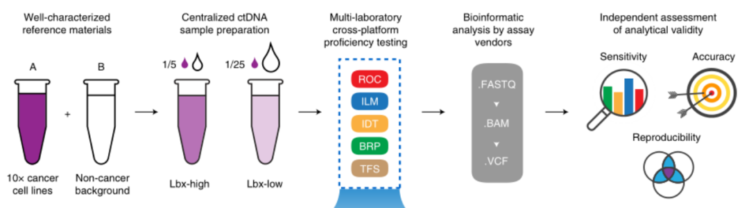 作者:肖燃 张振红 徐晓阳 孔金隆 侯瑾瑾 【摘要】 近期,SEQC2项目对5家全球领先肿瘤靶向NGS检测试剂盒厂商(Roche Sequencing Solutions(简称ROC)、Illumina、IDT(Integrated DNA Technologies)、Thermo Fisher Scientific(简称TFS),以及燃石医学(BRP)的ctDNA分析方法的分析性能进行多站点、跨平台评估的结果在线发表于Nature Biotechnology上。研究采用模拟测序数据和对人工合成的人类ctDNA参考材料,以ctDNA测序工作流程中每个步骤变量对分析结果的影响,严格评估五种领先的ctDNA分析方法的结果有效性。结果显示,当ctDNA VAF≥0.5%时,所有检测方法都能可靠检出(具有较高的灵敏度和重复性),但在ctDNA VAF<0.5%时,检测准确性有所下降,且各检测方法间存在差异。SEQC2项目结果显示,基于靶向捕获平台开发的燃石(朗清®168基因)ctDNA 检测panel在检测灵敏度、特异性、准确性、可重复性和稳定性等方面均有优异表现,从各维度横向比较均名列前茅。SEQC2项目所评估的灵敏度、假阳性率、可重复性等指标让临床可以直观、客观、全面、且定量地感受液体活检技术,为基于NGS的液体活检产品提供判断标准。 近年来,随着技术的不断更新推进,基于循环肿瘤DNA(ctDNA)的液体活检技术为驱动基因的检测及微小残留病灶(MRD)的追踪提供了精准、便捷的方法,成为早期肿瘤患者预后分层与复发风险评估的新兴手段,无法获得组织样本的肿瘤患者的有效替代方案,以及患者全病程管理的有效助力工具,具有重要的临床价值和良好的应用前景。 SEQC2研究通过单盲的多站点、跨平台分析性能验证,评估液体活检产品的临床实践核心指标,旨在建立行业标准,提供技术指南。研究纳入了5家全球领先肿瘤靶向NGS检测试剂盒厂商:Roche Sequencing Solutions(简称ROC)、Illumina、IDT(Integrated DNA Technologies)、Thermo Fisher Scientific(简称TFS),以及燃石医学(BRP),采用模拟测序数据和对人工合成的人类ctDNA参考材料,以ctDNA测序工作流程中每个步骤变量对分析结果的影响,严格评估五种领先的ctDNA分析方法的结果有效性。结果显示,当ctDNA VAF≥0.5%时,所有检测方法都能可靠检出(具有较高的灵敏度和重复性),但在ctDNA VAF<0.5%时,检测准确性有所下降,且各检测方法间存在差异。 1.SEQC2 研究内容与结果:ctDNA检测是从提取的含非肿瘤细胞的游离DNA —— cfDNA背景中识别的,为去除混杂的实验变量,首先生成模拟NGS文库,通过杂交捕获测序模拟无细胞DNA的靶向分析,然后使用模拟自然人类基因和突变的合成DNA序列评估ctDNA分析性能。血浆中ctDNA丰度的变化可能与患者肿瘤进展、对治疗的敏感或耐药等相关,因此,定性识别突变的同时,还须准确检测ctDNA突变频率。研究显示,在最大片段深度处,可以可靠地解析0.8%的变异等位基因频率(VAF),但低于该水平的VAF分析结果不准确,同时会受到测序深度与覆盖率的影响。证明患者早期或治疗期间准确识别低频ctDNA突变具有难度。 图1 肿瘤ctDNA高通量测序性能评估过程 2.灵敏度评估-不仅仅需要足够的测序深度:ctDNA中包括大量低丰度基因变异,一直以来液体活检临床应用的最大瓶颈在于低丰度突变的准确检出,提高测序深度有助于提高检测灵敏度已成为临床专家普遍共识。然而SEQC2项目结果显示,当建库技术能力受限时,单纯增加测序深度已无法有效提高检出率,只有当建库技术提升了灵敏度的天花板,测序深度才能带来更准确的结果。此外,测序覆盖率、覆盖的均一性等也非常重要。SEQC2项目结果揭示了不同建库技术之间的能力差别。 (1)覆盖深度与有效片段回收率:有效片段回收率代表相同体积血液经过重重信号采集和处理后被有效保留的细胞游离DNA(cell free DNA,cfDNA)片段,可直接决定ctDNA检出的可能性。SEQC2项目中测序的单片段中位覆盖深度在1,235X-4,698X之间,ROC(4,698X)>BRP(4,528X)>TFS(3,280X)>IDT(2,476X)>LIM(1,235X),有效片段回收率为 63%>60%>44%>33%>17%,意味着ctDNA建库技术方面ROC(罗氏)和BRP(燃石)表现最好。 (2) panel覆盖均一性:在同样都是25 ng的DNA投入量情况下(相当于7500个基因组拷贝),SEQC2比较了不同panel测序深度对目标设计区域覆盖率的差异,更好的覆盖均一性可以保障即使困难区域也能得到良好的覆盖,从而提升检测的灵敏度。覆盖均一性最好的是BRP(燃石)和IDT。另外,在燃石朗清与ROC panel有效片段回收率相近的情况下,燃石朗清的覆盖均一性更好。综合以上参数看到,即使原始测序深度并非最高的燃石,在充分保证有效片段回收率、覆盖均一性的情况下,灵敏度仍表现非常突出。 高灵敏度检测不仅有助于更精准的晚期用药指导,更加拓展了液体活检的临床应用场景。将液体活检获益的患者从晚期推进到围手术期的MRD(微小残留病灶)检测技术进展迅速,与检测灵敏度的提升密不可分。随着技术的发展和完善,灵敏度的提升有望进一步扩大从液体活检中获益的患者数量,让更多患者受益。 3.保证液体活检准确性,高灵敏度和低假阳性率缺一不可:临床最关注的液体活检panel性能指标除了灵敏度之外,还有假阳性率,即检测特异性。高灵敏度可保证低频突变的准确识别、不漏检,高特异性则保证“火眼金睛”识别肿瘤来源突变,为患者抓取真正获益的治疗机会,避免错过最佳治疗时间和经济浪费,技术层面往往在灵敏度和特异性不可兼得,如何平衡是液体活检技术准确性面临的又一难题。 SEQC2通过对每个文库目标区域已知变异的检出结果分析,来评估