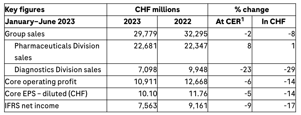 一、罗氏 7 月 27 日,罗氏公布 2023 上半年业绩,营收 297.79 亿瑞士法郎,同比-2%(按 CER 计算);净利润为 75.63 亿瑞士法郎,同比-9%;研发投入 64.49 亿瑞士法郎,同比增加 8%。