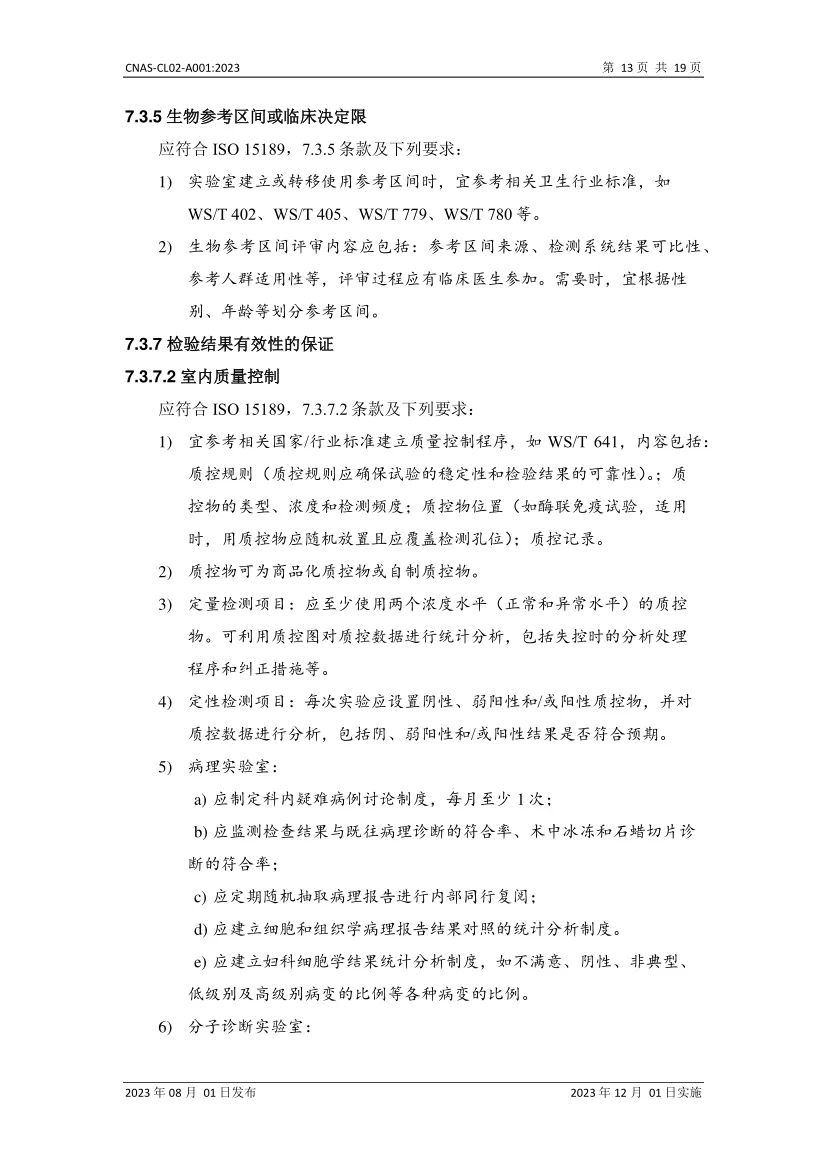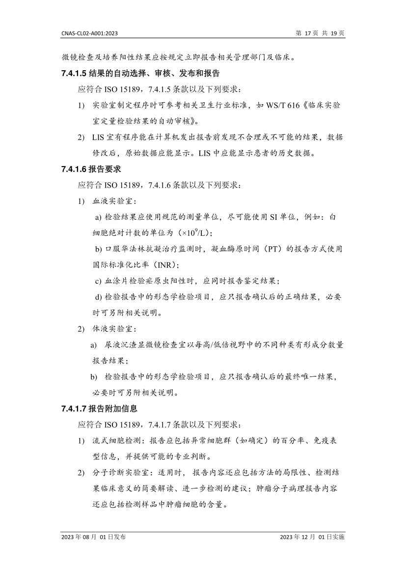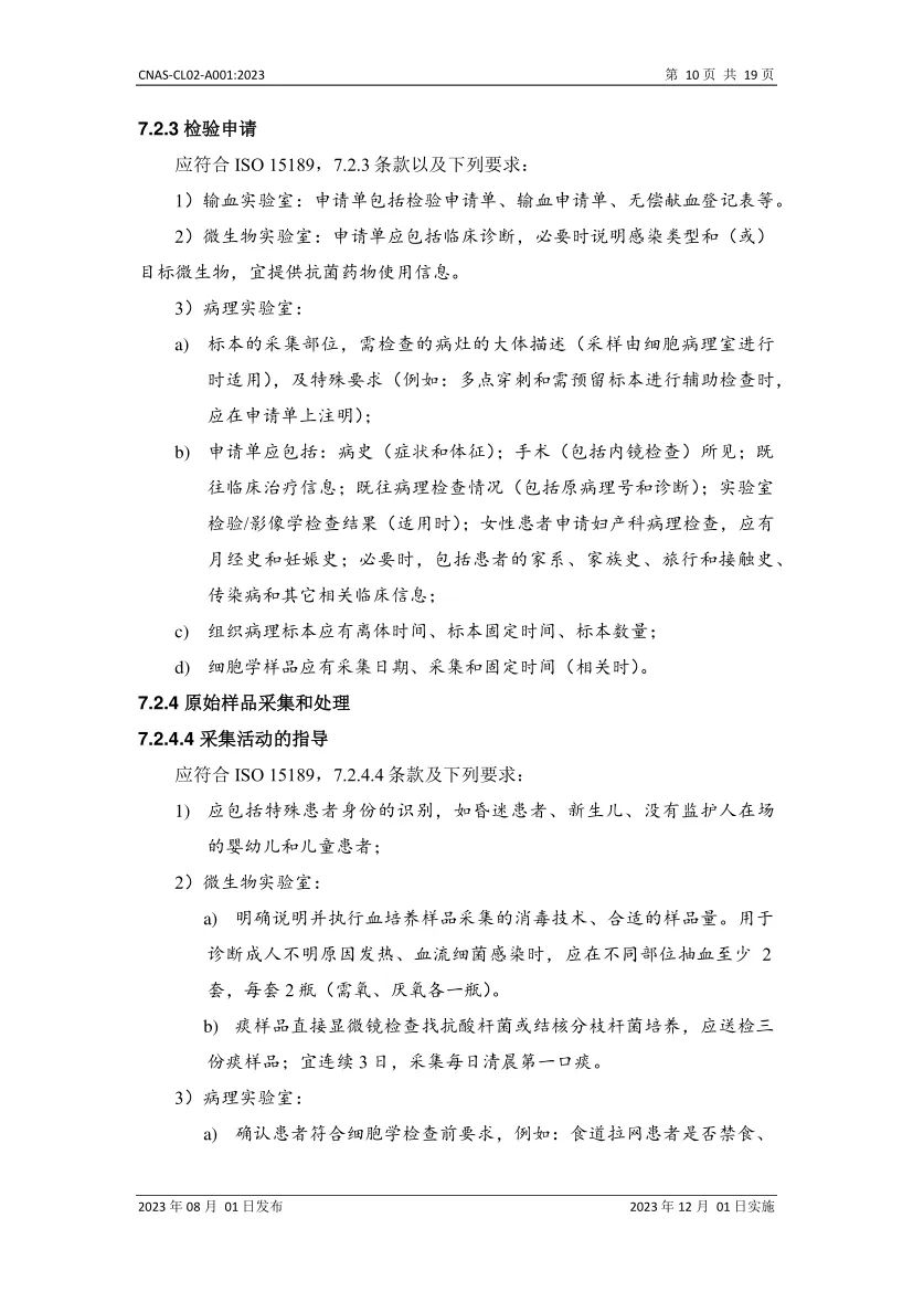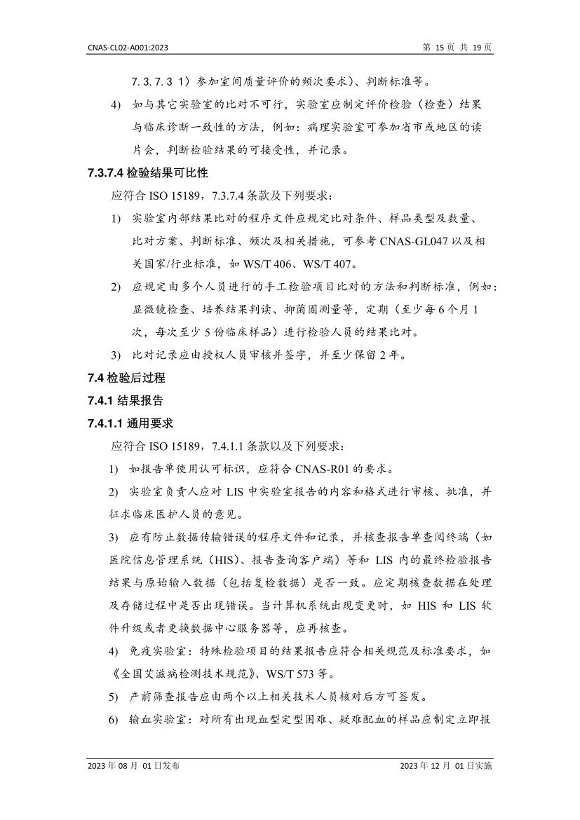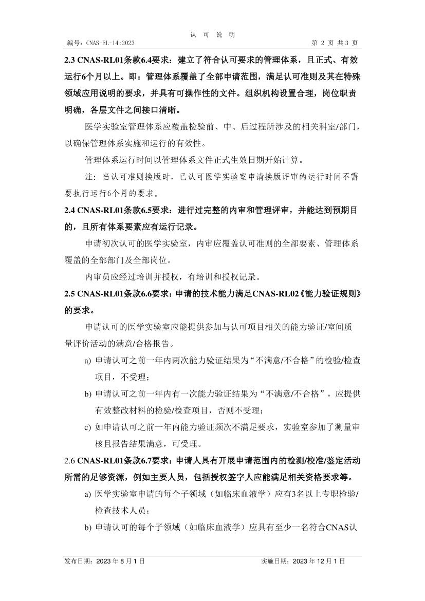 8月1日,中国合格评定国家认可委员会(CNAS)发布通知,CNAS-CL02-A001:2023《医学实验室质量和能力认可准则的应用要求》和CNAS-EL-14:2023《医学实验室认可受理要求的说明》已完成修订工作,于2023年8月1日发布,2023年12月1日实施。