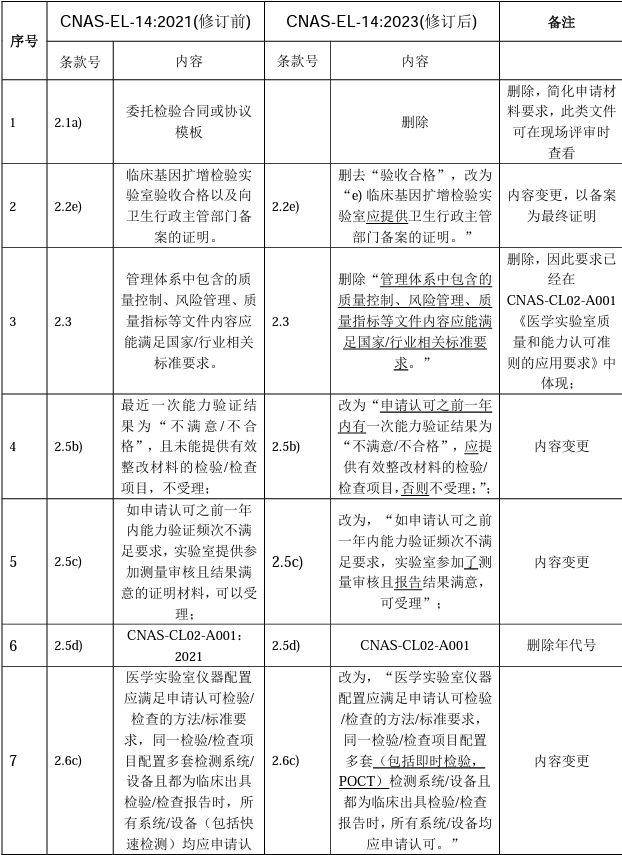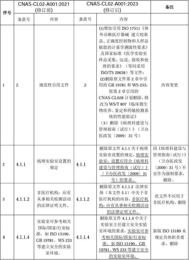 《医学实验室认可受理要求的说明》2023版与2021版修订内容差异如下: