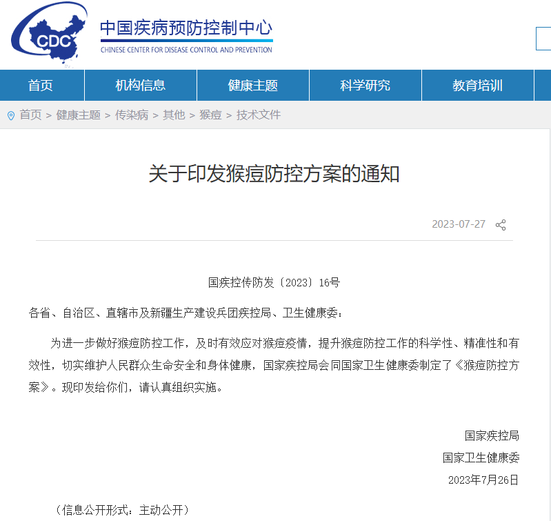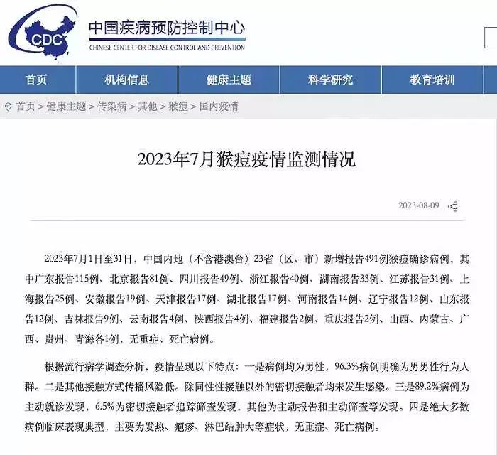 中疾控网站9日发布《2023年7月猴痘疫情监测情况》,全文如下: