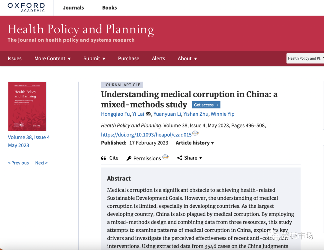 2023年2月,学术期刊《Health Policy and Planning》上发表了一篇中国与美国研究人员合作的论文,题为《Understanding medical corruption in China: a mixed-methods study》,该研究由中国与美国研究人员合作,通过多种数据收集方法,分析了中国当前的医疗腐败状况。 医疗腐败是实现与健康相关的可持续发展目标的重大障碍。然而,对医疗腐败的理解有限,特别是在发展中国家。 这项研究采用了混合方法设计,并结合了来自三种不同数据来源的信息,旨在探究中国医疗腐败的模式,探讨其关键驱动因素,并调查最近反腐败干预措施的效果。研究团队聚焦过去医疗腐败中普遍存在的“红包”问题,开展了全国性的调查。通过与17位医疗领域的“关键证人”进行深入访谈,包括医药代表、医疗管理者、医生和患者等。研究结果显示,过去普遍存在的“红包”现象逐渐减少。根据2011年到2018年的全国调查数据,仅有0.4%的门诊患者和1.4%的住院患者承认曾给医生“红包”。此外,通过分析2013年至2019年中国判决在线网站上的3546起案件,研究发现贿赂、贪污和保险欺诈分别占所有医疗腐败案件的68.1%、22.8%和9.1%。在中国裁判文书网的医疗受贿案例中,绝大多数(79.8%)受贿主体与医疗机构有关,政府部门占比14%,而医疗保险单位为6.2%。与医疗机构的主导地位相符,受贿涉及的领域排名前列,其中药品受贿占32%,器械占26%,基础建设占16%,一次性耗材占12%,而人员调动与保险报销仅分别占8%与6%。从数据中可以看出,医疗腐败的焦点已从“红包”转向商业贿赂。供应商如药品、医疗设备等为了在商业竞争中获利,常常向医疗机构的工作人员行贿。商业贿赂现象日益普遍,特别是在医药代表等领域,成为当前医疗领域反腐的重中之重,而这也是当下这场全范围反腐的开篇行动。然而,在应对医疗腐败问题时,不仅需关注红包和商业贿赂等方面。尽管医疗腐败有所减少,问题并未消失,其危害仍然存在。医患关系的紧张局势以及长期医疗服务行业的可持续发展依然受到威胁。因此,研究提出,综合措施是应对医疗腐败问题的关键。借鉴其他发达国家的经验,引入制度性手段如“Sunshine Act”可能是有效的解决方案。“Sunshine Act”(全名为Physician Payments Sunshine Act)是美国的一项法律,旨在增加医疗行业的透明度和公开性,特别是关于医药企业与医疗服务提供者之间的经济往来。该法案于2010年通过,是美国《患者保护与平价医疗法案》(Affordable Care Act)的一部分。Sunshine Act要求医药公司和医疗器械制造商定期向联邦政府报告与医生、医院、医疗机构等相关的经济交往和支付。这些报告包括向医疗专业人员提供的各种形式的补偿,如餐饮、旅行、咨询费用、演讲费用、赞助的教育活动等。这些信息随后会被公开发布在一个名为“Open Payments”(公开支付)的联邦数据库中,供公众、患者和监管机构查阅。Sunshine Act的目标是增加医疗行业内部的透明度,减少潜在的利益冲突,并提高医生和患者对于医药公司与医疗机构之间经济交往的了解。这有助于防止潜在的腐败行为,确保医疗决策的公正性,并增加公众对医疗系统的信任。许多其他国家也在考虑或实施类似的透明度法案,以更好地监管医疗行业的经济关系,从而维护医疗体系的正直和可靠性。自2012年以来的反腐败运动、国家带量采购和打击医疗保险欺诈的特别运动都减少了医疗腐败的机会,这意味着中国在打击医疗腐败方面取得了积极进展。诚然,纯粹依赖制度难以彻底解决医疗腐败所带来的挑战。研究也显示,财务压力和监督薄弱是腐败行为的两个主要原因。如何解决上述这两项问题,也是当下这场反腐运动的关键所在。
