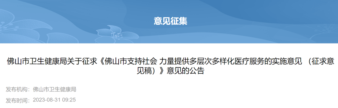 近日,广东佛山卫生健康局发布了“关于征求《佛山市支持社会 力量提供多层次多样化医疗服务的实施意见 (征求意见稿)》意见的公告”。