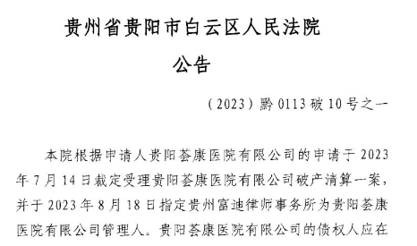 8月18日,贵阳市白云区人民法院发布公告,称已正式受理贵阳荟康医院破产清算一案,目前正在推进相关程序。