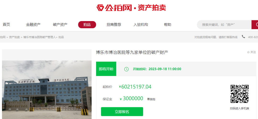 公告显示,接受拍卖的标的物为博乐市博冶医院等九家单位的破产财产”,起拍价约2217万元,将于2023年9月18日开拍。
