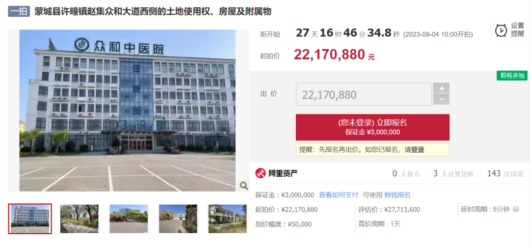 据阿里拍卖了解,“蒙城众和中医院所有的位于蒙城县许疃镇赵集众和大道西侧的土地使用权、房屋及附属物”将于9月4日开始竞拍,起拍价约2217万元。