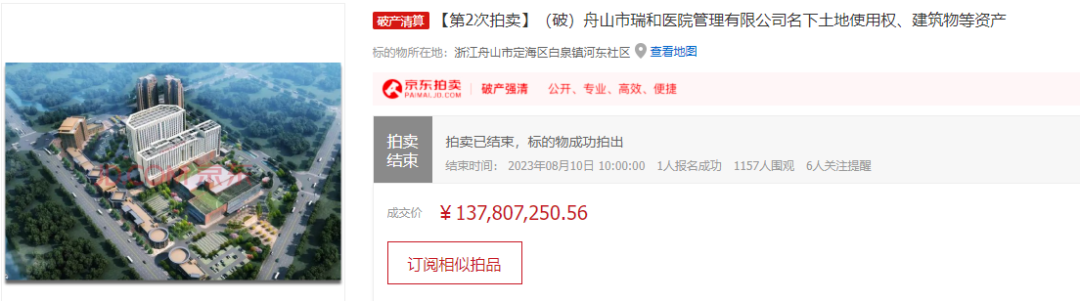 8月10日,在京东拍卖平台上,舟山市瑞和医院管理有限公司名下土地使用权、建筑物等资产以1.37亿元的价格被拍卖出去。拍卖内容包括72048平方米的土地使用权,医院综合楼、宿舍楼、 后勤物业楼等建筑物,以及分院所用的机器设备、车辆等固定资产等。