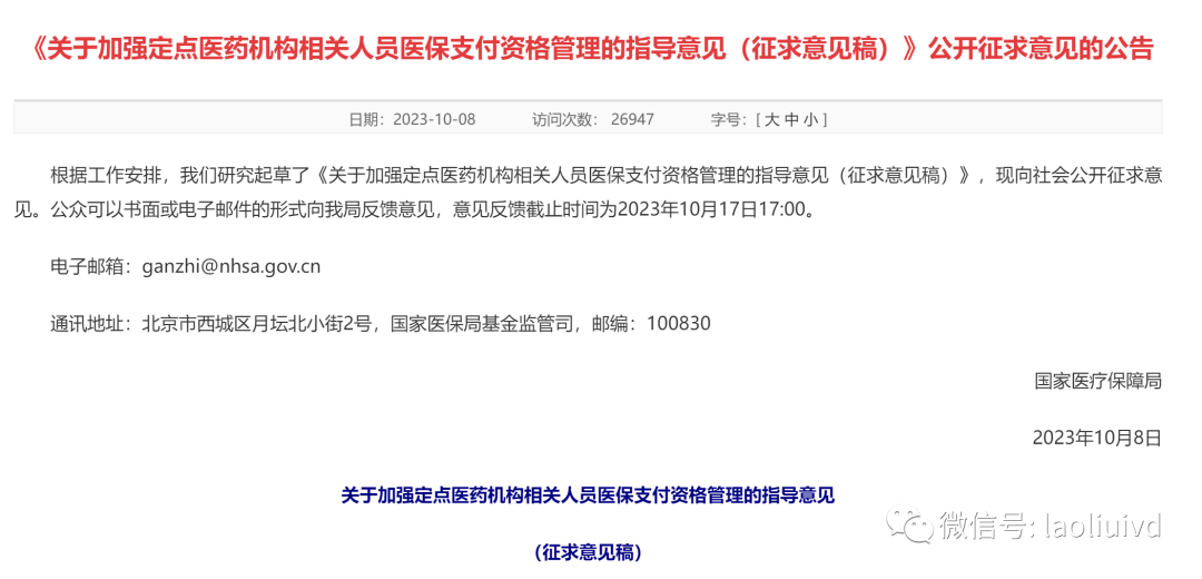 10.8号,国家医疗保障局发布了《关于加强定点医药机构相关人员医保支付资格管理的指导意见(征求意见稿)》,面向社会公开征求意见,意见的截至时间是2023.10.17号17:00,根据公布的时间,以及截至时间,正好7个工作日,时间很赶,现在医疗机构一头忙着FF,又开始了被监管,在这样的大政策之下,对于行业的影响几何,我们娓娓道来。