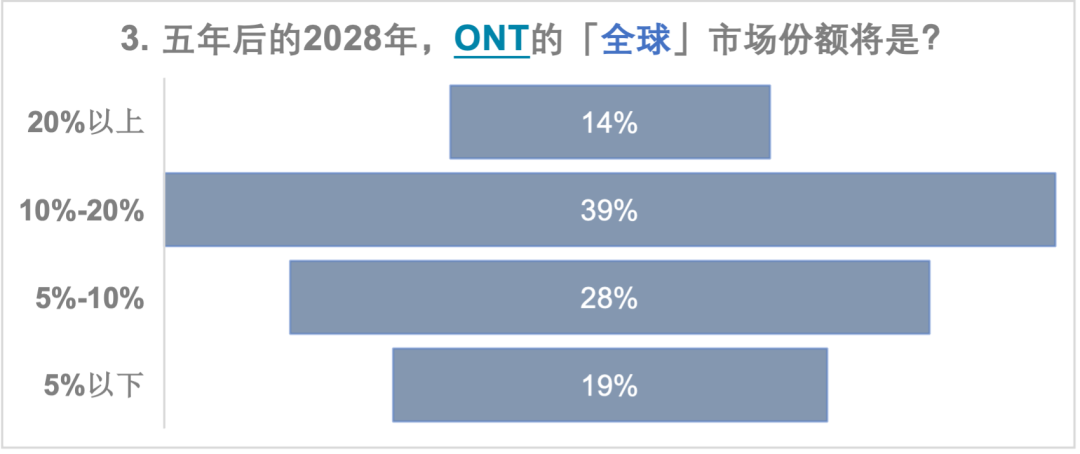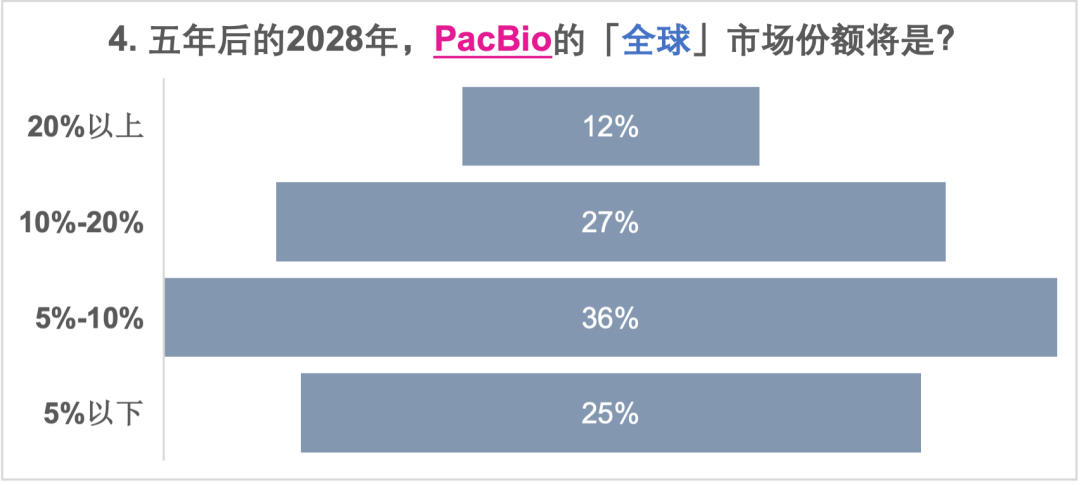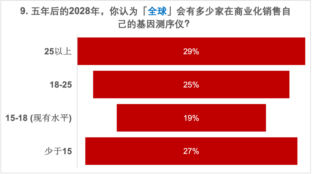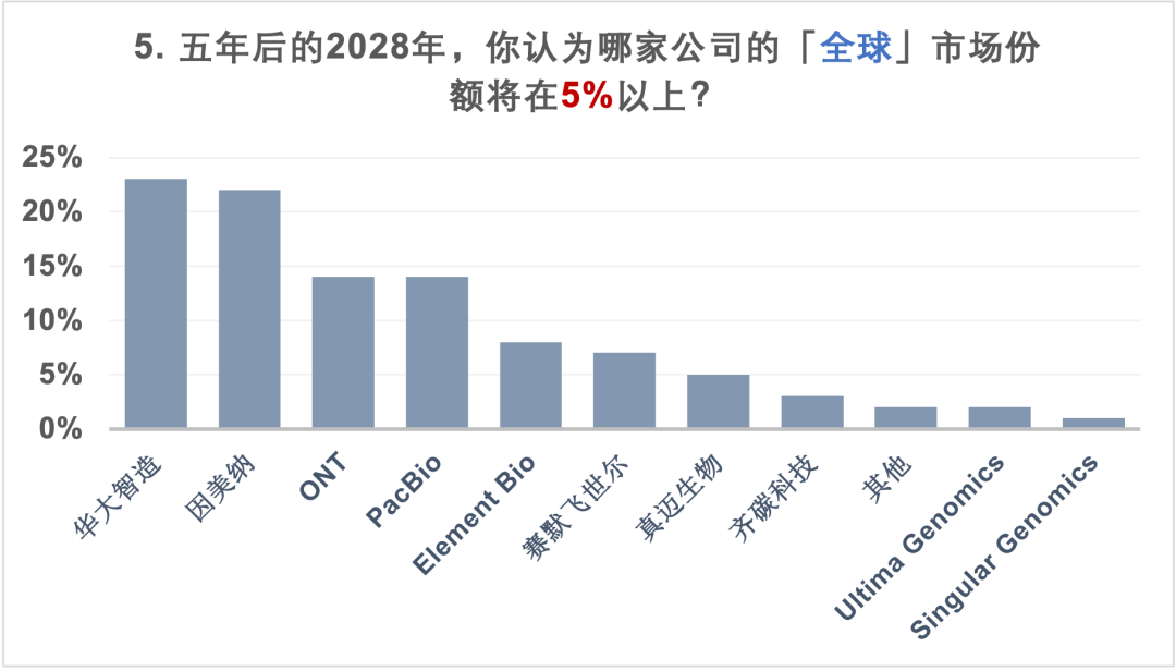 更多的人觉得因美纳的全球市场份额会掉到30%-50%,而华大智造的全球份额会来到30%; 等多的人觉得ONT的全球市场份额会上到10%-20%,而Pacbio会停留在5%-10%,大家更看好ONT; 回到中国市场,因美纳的市场份额落在了30%的水平,华大智造的份额集中在50%的水平; 在全球市场,可能能拿到5%市场份额的有力竞争者,除了传统的几大家,大家似乎都更关注Element Bio,而本土选手真迈生物和齐碳科技也具备本土竞争力。 在五年后的测序仪品牌可选数量上,分歧意见最大,最少的人选择了现有的数量,一半以上的人都认为会有更多的测序仪提供商进入市场。