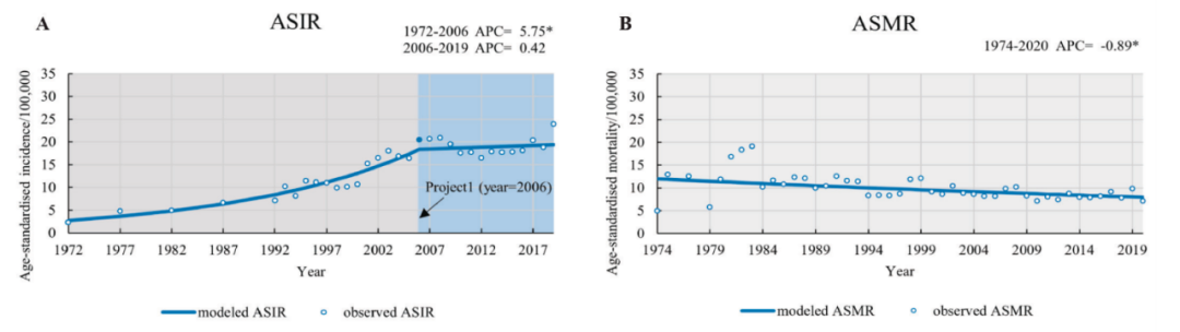 *仅供医学专业人士阅读参考 结直肠癌(CRC)是我国常见恶性肿瘤之一,发病率逐年呈上升趋势。2020年中国癌症统计报告显示,我国结直肠癌发病率、死亡率在全部恶性肿瘤中分别位居第2和第5位,疾病负担沉重。 同时,我国地域辽阔,经济发展和医疗卫生资源存在巨大差异,这也导至了不同地区CRC发病率的不同。因此,了解我国不同地区和省份的CRC流行病学数据对实施优化预防策略和医疗资源的分配至关重要。 近期,浙江大学医学院公共卫生学院李雪/宋培歌团队,首次系统回顾了中国过去近50年(1972-2020年)CRC发病率和死亡率的趋势以及相关危险因素。 整体上看,我国CRC发病率逐渐增加,但呈现放缓趋势,从1972年的2.75增加到2019年的19.39(每10万人年),而CRC的死亡率从1974年的12.00下降到2020年的7.95(每10万人年),呈小幅下降趋势。 此外,她们在探讨了与中国人群CRC相关的危险因素后发现,有16个属于社会人口统计学、人体测量学、生活方式和饮食、个人和家族疾病史,以及心理健康状况类别的因素与中国人群CRC风险有关。 研究发表在Journal of Global Health上[1]。 论文首页截图 正如上文所说,我国不同地区CRC发病率不同,为了对中国及中国不同地区CRC发病率、死亡率以及相关危险因素做一个全面概述,研究人员从7个全球和中国大型数据库中筛选了493篇中国以及中国各省、市、县疾控中心的CRC发病率、死亡率和危险因素的相关数据。其中271篇文章是关于CRC发病率和死亡率的,222篇文章是关于CRC相关危险因素的。CRC发病率和死亡率变化趋势用年度百分比变化(APC)表示。 汇总分析显示,整体上看,在国家层面,CRC发病率从1972年的2.75增加到2019年的19.39(每10万人年),增速放缓趋势(1972-2006年APC=5.75,P<0.05;2006-2019年APC=0.42)。CRC的死亡率从1974年的12.00下降到2020年的7.95(每10万人年),呈小幅下降趋势(APC=-0.89;P<0.05)。 近年来,我国CRC发病率和死亡率的趋势,ASIR为发病率,ASMR为死亡率 在地方层面,研究人员按照我国6个地理区域(华东、华北、东北、西北、中南和西南)和4个经济区域(东北地区、东部地区、中部地区和西部地区)进行了划分。 结果显示,从地理上看,2008年以来,东北和华东地区CRC发病率下降趋势不明显,华北、西北和西南地区呈上升趋势,中南地区略有波动。此外,从2000年开始,CRC死亡率在中国东北、华北、西北和西南地区均呈显著上升趋势,但在2007年以后,东北地区的CRC死亡率有下降趋势,华北地区处于波动状态。 从经济区域看,中部地区和西部地区CRC发病率有所增加,东部地区增加趋势放缓,东北地区有所下降。在CRC死亡率方面,西部地区呈显著上升趋势、中部地区略有上升,东部和东北地区都处于下降趋势。 在评估我国各省份CRC发病率和死亡率差异后,研究人员发现,在2011年至2015年间,辽宁、上海、广东、四川和广西的CRC发病率和死亡率排名最高,而新疆、山西和甘肃CRC发病率和死亡率则相对较低。 我们知道,从癌前病变到CRC形成之间有一个过渡阶段,了解CRC相关危险因素,对于CRC预防而言十分重要。在本研究中,研究人员分析了62个可能与CRC有关的危险因素,最终在高质量研究中,确定了16个与中国CRC有关的危险因素。 这16个因素可按照社会人口统计学、人体测量学、生活方式和饮食、个人和家族疾病史以及心理健康状况这几个类别进行划分。其中,高BMI(BMI≥24 kg/m2)指数、吸烟、饮酒和情绪管理不良均与CRC风险增加显著相关(OR分别为1.37、1.19、1.35和2.51);运动和蔬菜摄入则与CRC风险降低有关(OR分别为0.67和0.55)。(更完整的相关危险因素见下图) 16个与CRC有关的危险因素,红色为正相关,蓝色为负相关,灰色代表没有相关性 总之,这是首个全面评估我国CRC发病率和死亡率趋势,并确定相关危险因素的研究。整体上看,中国CRC发病率虽然持续增加,但呈现放缓趋势,死亡率也呈逐渐下降趋势。但我国各地区和省份的CRC发病率和死亡率差异依然很大。本文作者认为,未来还需进一步制定针对CRC高发病率地区的政策,促进疾病预防,减轻总体疾病负担以便缩小区域差异。 参考文献: [1]Xu L, Zhao J, Li Z, Sun J, Lu Y, Zhang R, Zhu Y, Ding K, Rudan I, Theodoratou E, Song P, Li X; Global Health Epidemiology Research Group (GHERG). National and subnational incidence, mortality and associated factors of colorectal cancer in China: A systematic analysis and modelling study. J Glob Health. 2023 Oct 13;13:04096. 本文作者丨张金旭 |