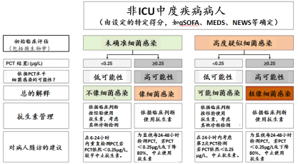 用于呼吸道感染的ABS临床试验的PCT推断 PCT-指导ABS的概念,首先在低呼吸道感染的ED病人进行检测[19]。考虑了在病毒感染的PCT依然很低(未检出)、而在细菌感染中升高,若PCT水平各自为<0.1 μg/L或<0.25 μg/L,研究推断建议,非常强烈或强烈地反对使用抗生素。推断也包括了一些否决的指标,所以,处于非常高风险的病人依然按照经验治疗,除非很低的PCT水平。按此,给出了两个水平的建议,也为PCT高于<0.25 μg/L的病人,开始抗生素治疗建议,以及PCT高于<0.5 μg/L(抗生素强烈地建议)。研究展现了在抗生素使用率上显著的减少,特别对气管炎和COPD加剧的病人。 以后不仅研究了PCT对开始凭经验的抗生素治疗,而且也使用PCT去监视治疗的响应,并在各个病人基础上决定中止抗生素治疗[19,20]。PCT下降低于0.25 μg/L、或从峰值下降至少>80%-90%,被用作停止使用抗生素的规则临界值。这个方式进一步减少了抗生素使用,通过缩短治疗的期限,特别是对CAP病人。以后的一个大型的遍及瑞士的、随机化的、非自卑试验(non-inferiority),发现这个方式在减少抗生素使用超过3天上高度有效,没有增加不利后果的风险[16,21]。 今天,多个类似的试验在不同国家和不同临床情况下实施(即,从初级治疗到急诊部和住院病房,到重诊监视病房)。最近的荟萃分析包括来自12个不同国家的26项随机对照试验的6708名不同类型和严重程度的呼吸道感染病人的各个病人数据,调查了PCT指导的抗生素决策[22,23]在呼吸道感染情况下的效果(与总体情况相比) 数据荟萃分析,病人级别的数据荟萃分析允许按感染类型和临床环境对结果定义和亚组分析进行标准化。该研究表明,在呼吸道感染中使用PCT可以减少抗生素的暴露(抗生素的起始剂量从86%降低到72%,总暴露量从8.1天减少到5.7天),抗生素的副作用(从22.1%降低到16.3%),死亡率显着降低14%(从10%降至8.6%)。结果在不同的临床情况(即初级治疗、ED、或critical care急救护理)、以及感染类型(肺炎、气管炎、COPD加剧)等是一致的。 在临床试验中使用的PCT判断限的第二次分析,揭示了用于开始使用抗生素的主要判断限,适用于病人的严重性。因此,在初级治疗或ED中处于轻微或中度疾病病人,使用了PCT判断限0.25 μg/L,而严重疾病的病人(即,要求入住ICU病房)主要使用判断限为0.5 μg/L[24]。同样,对轻微/中度或严重疾病的,为中止抗生素使用的PCT各自为0.25 μg/L或0.5 μg/L,或PCT显示了从峰值下降≥80%[8]。 *警示内容:对具有免疫抑制(包括HIV)、CF(囊性肺纤维化(cystic pulmonary fibrosis))、胰腺炎、烧伤、大容量输血、疟疾等;以PCT指导的管理不应用于慢性感染(如,脓肿、骨髓炎、心内膜炎)。 图1:非ICU中轻微疾病病人PCT的使用 *警示内容:对具有免疫抑制(包括HIV)、CF(囊性肺纤维化(cystic pulmonary fibrosis))、胰腺炎、烧伤、大容量输血、疟疾等;以PCT指导的管理不应用于慢性感染(如,脓肿、骨髓炎、心内膜炎)。 图2:非ICU中中度疾病病人PCT的使用 *警示内容:对具有免疫抑制(包括HIV)、CF(囊性肺纤维化(cystic pulmonary fibrosis))、胰腺炎、烧伤、大容量输血、疟疾等;以PCT指导的管理不应用于慢性感染(如,脓肿、骨髓炎、心内膜炎)。 图3:对ICU中严重疾病病人PCT的使用 脓毒症中PCT指导ABS的临床试验和推断 使用PCT对个性化抗生素治疗提及的概念,也吸引了ICU脓毒症病人。但是,开始关注的是对最严重病人这个方式的安全,由于太短时间使用抗生素,可能会造成感染复发和较高的死亡率。第一个概念验证研究是对ICU中脓毒症的病人[14],发现减少抗生素暴露,没有以往对后果的负面影响。该试验对脓毒症病人使用了较高PCT判断限(0.5-1 μg/L),也使用了PCT的动态观察(从峰值水平减少到>90%),建议中止抗生素。这个概念以后在多中心、非自卑(non-inferiority)PRORATA试验中[17],PCT在脓毒症病人中使用是充分和安全的。因为ICU的脓毒症病人具有一个先天高风险,治疗时间是决定性的。使用PCT主要为早期中止治疗,但不是为指导经验治疗[25]。这个概念以后也在降钙素原指导中止抗生素(SAPS)研究中检测确认,该研究中的所有具有疑似脓毒症病人开始了抗生素治疗,在PCT水平至少从峰值减少了80%、或PCT将到低于0.5μg/L下中止抗生素。与标准治疗比较,使用PCT可减少抗生素的暴露(抗生素持续从7天到5天),并改善了存活(在1年里6.1%较好的存活)[7]。 一个近期对11个在危急脓毒症疾病病人中以PCT指导ABS的临床试验,进行的病人-水平荟萃分析[26],也发现在2252例PCT-指导病人,较2230例对照组病人的死亡率显著地较低(21.1%yu 23.7%)。这个发现与按照感染类型(呼吸道、尿道、腹部、皮肤或中枢神经系统)、脓毒症-3定义或脓毒症的严重性(由相继器官衰竭评估确定[SOFA]得分、存在脓毒症休克或肾衰、或需要加压或供氧支持)分类的亚组分析一致。研究也揭示了,在脓毒症病人中,PCT使用导至较早中止抗生素、并减少治疗持续从10.4天到9.3天,看来对较少严重脓毒症病人和呼吸道感染病人有较强烈的作用。进一步的荟萃分析也揭示了,存活的好处与仅为抗生素中止的PCT推断有关,而对ICU病人,PCT推断对抗生素开始或混合方式,没有减少死亡率[27]。最后,集中关注具有培养阳性的细菌感染病人的荟萃分析,也发现了对抗生素用法上PCT使用的显著作用,没有不利的临床后果的证据,除了缩短了抗生素的持续使用[28]。