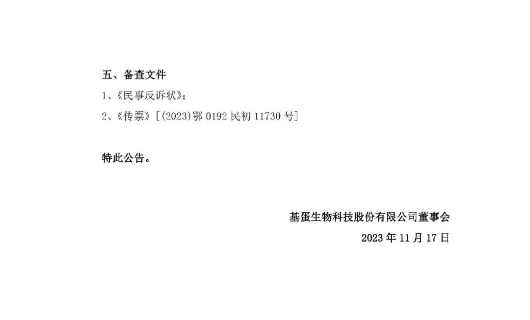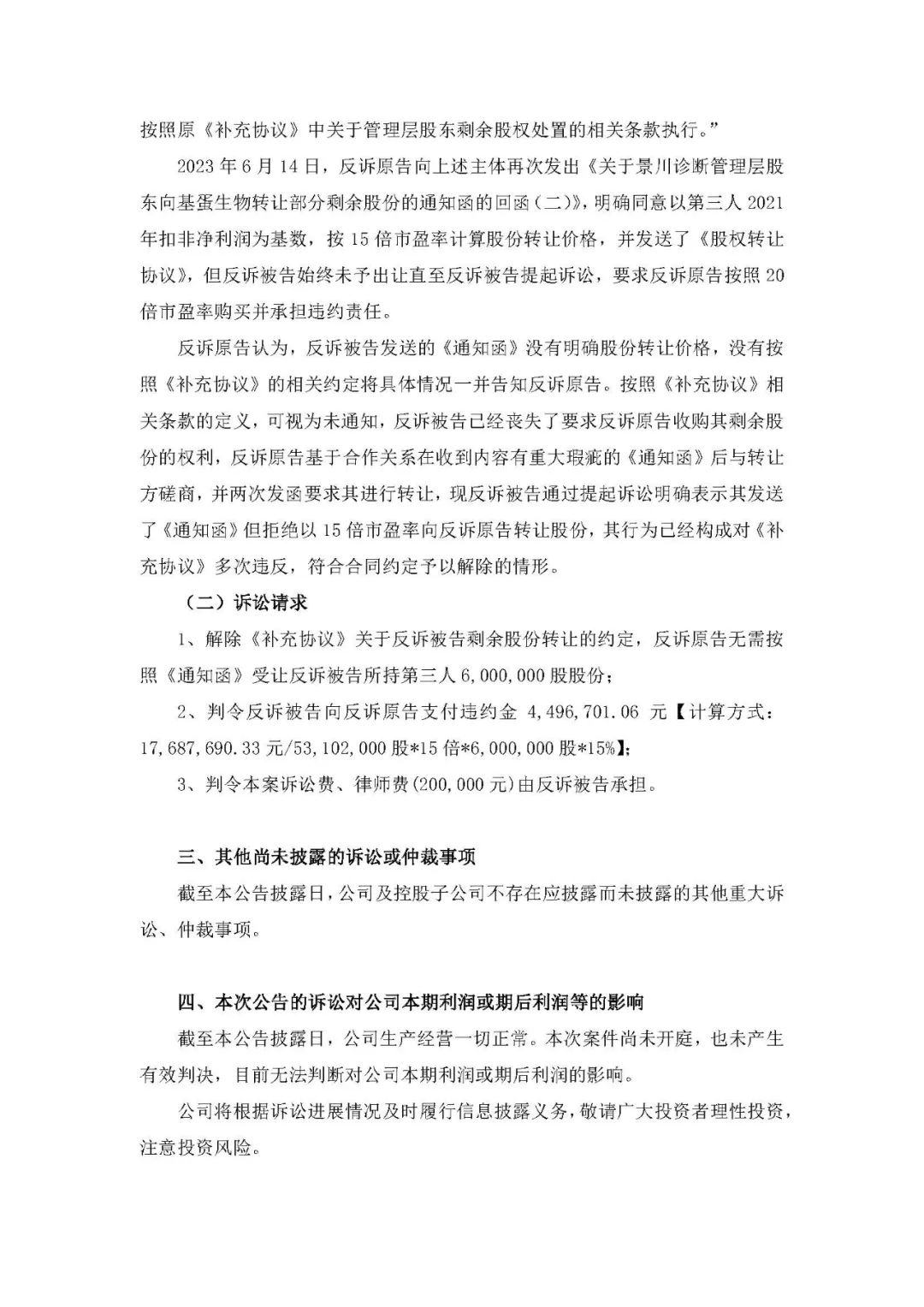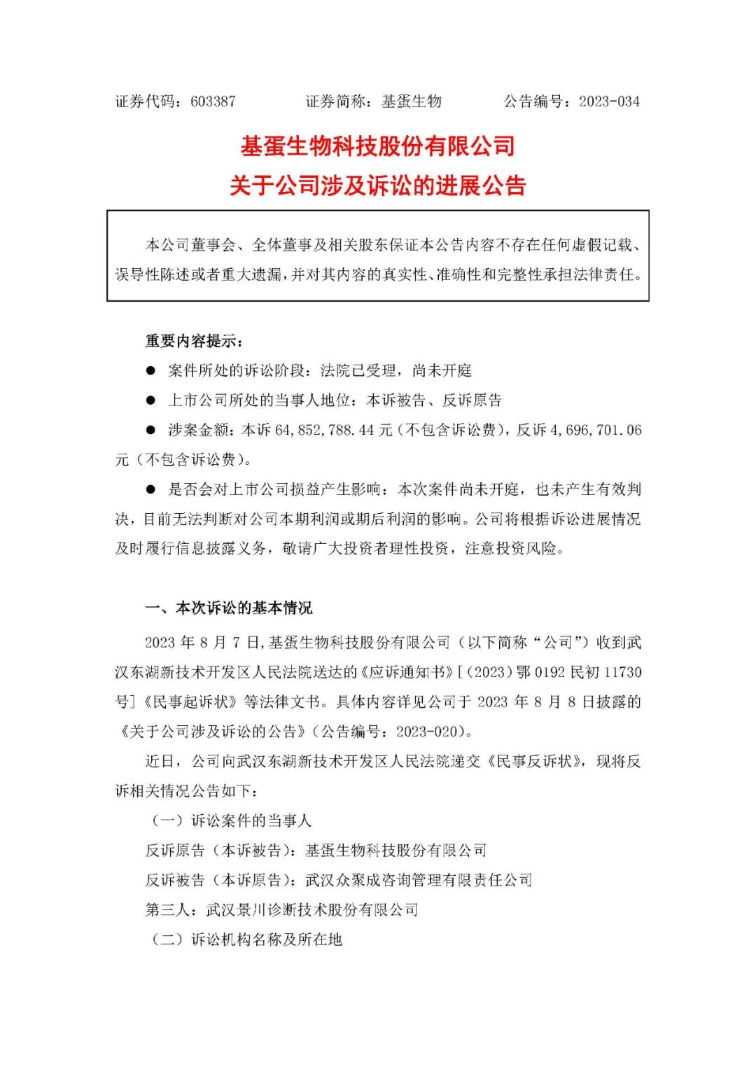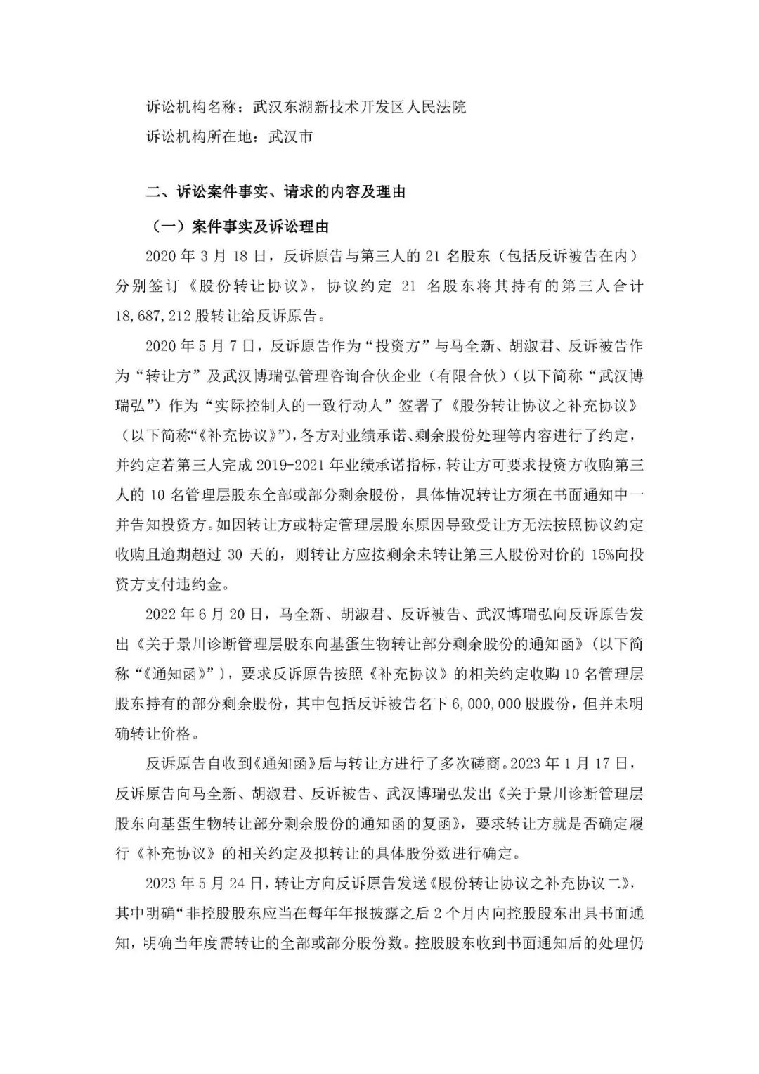 11月17日,基蛋生物发布涉诉公告。作为反诉原告,状告武汉众聚成咨询管理有限责任公司,第三人为武汉景川诊断技术股份有限公司。 基蛋诉讼请求为: 1、解除《补充协议》关于反诉被告剩余股份转让的约定 ,反诉原告无需按照《通知函》受让反诉被告所持第三人6000 ,000 股股份; 2、判令反诉被告向反诉原告支付违约金4,496,701.06 元【计算方式:17,687,690.33 元 /53102000 股 *15 倍 *6,000,000 股 * 】; 3、判令本案诉讼费、律师费 (200 ,000 元)由反诉被告承担。 8月3日,新三板上市公司景川诊断发布公告,公司持股10%以上的股东武汉众聚成咨询管理有限责任公司状告基蛋生物科技股份有限公司,第三人为武汉景川诊断技术股份有限公司。(基蛋生物,被告了!) 原告诉讼要求: 被告立即收购原告持有的武汉景川诊断技术股份有限公司【8400000】股股份;向原告支付股份收购款【55958946.47】元; 向原告支付违约金【8393841.97】元; 诉讼费等等。 景川诊断是基蛋生物的控股子公司。 2020年,基蛋生物公告收购武汉景川诊断54.9624%的股份,收购总价款为63,910,265.04元人民币;股份转让完成后,公司拟按照3.42元/股的价格认购景川诊断新增股份,认购金额为10,000,080.00元。本次交易完成后,基蛋生物将持有景川诊断58.5289%的股份。收购及增资后,景川诊断成为公司控股子公司,并纳入公司合并报表范围。通过景川诊断,公司将进入凝血检测的行业细分领域,开拓公司凝血检测业务板块。 双方打官司的原因是: 景川的原股东认为,按照收购要求和对赌承诺,相关目标已经实现,希望基蛋生物按照约定价格收购相关股东剩余股份。 基蛋生物则认为,双方沟通过程中,被告存在多次违反协议的情况,已经丧失了收购剩余股份的权利。
