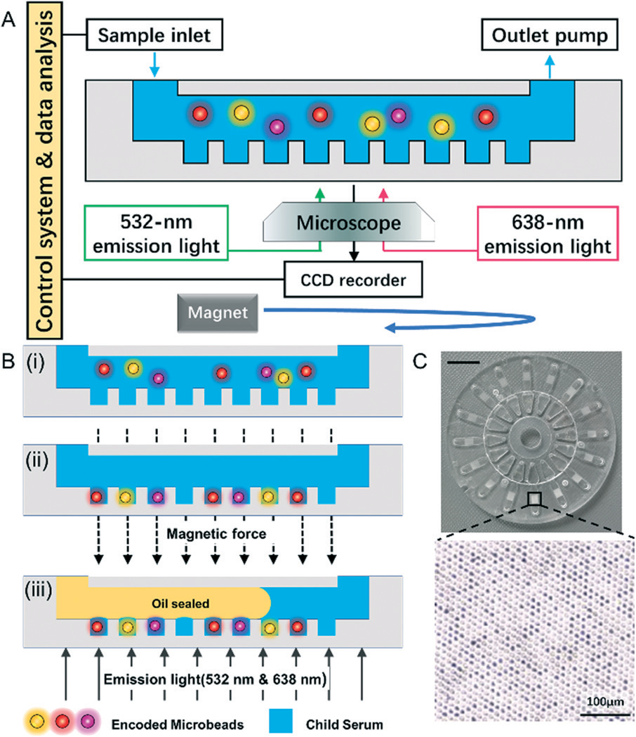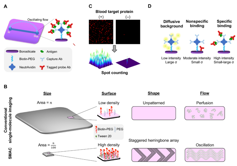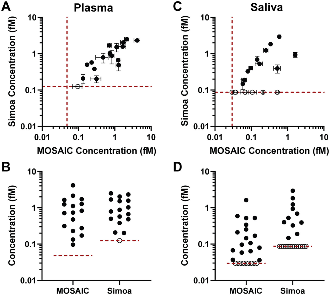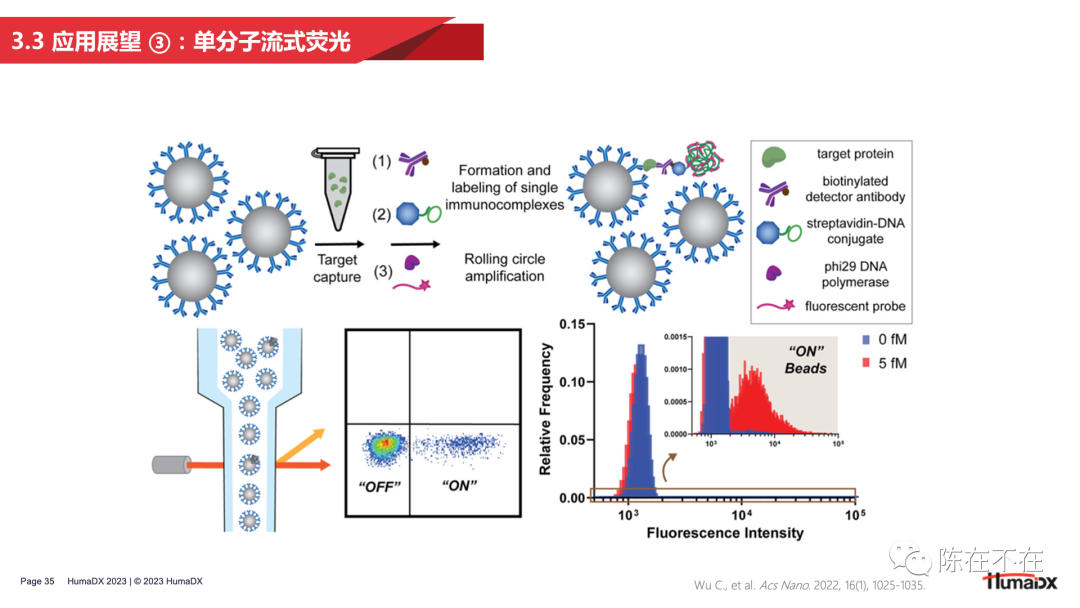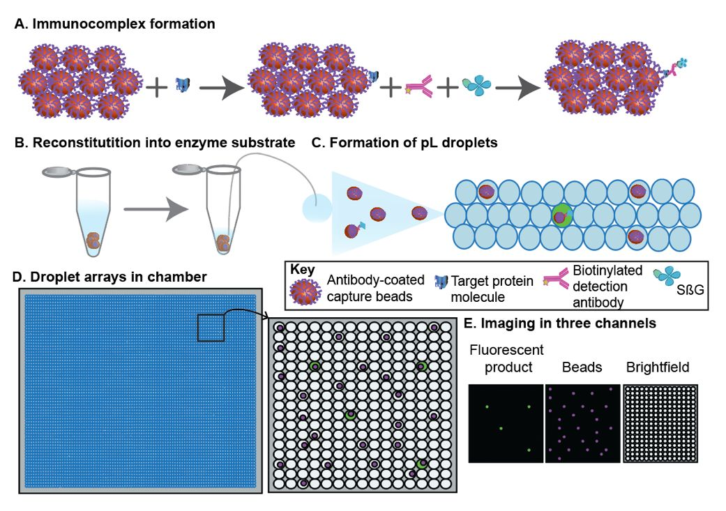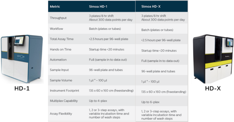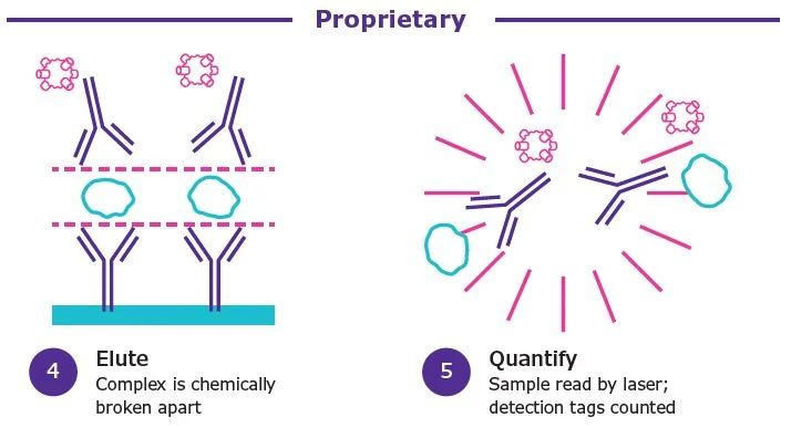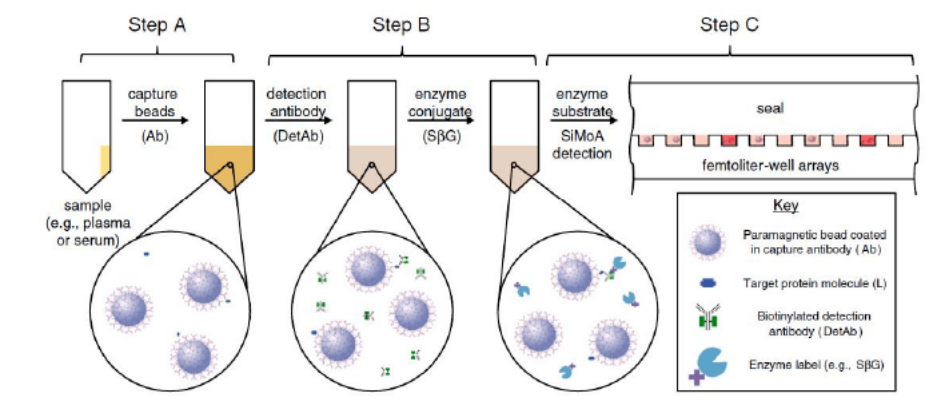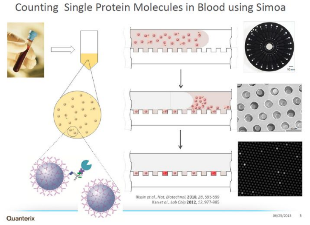 随着阿尔茨海默症(AD)药物获批单分子免疫检测Quanterix公司股价大涨。随之而来的阿尔茨海默症相关检测、治疗、护理、心理疏导等多方面产业均有利好。其中检测领域爆出260亿元市场规模,各大厂家争相入场。 AD症的检测历来以认知测试、影像、脑脊液指标为主。主要原因是脑中Aβ聚集在血脑屏障内发生,大多数标志物无法大量穿过血脑屏障在外周血中被检测到。比如p-tau蛋白血液含量含量仅为1pg/mL左右,分型的磷酸化Tau蛋白如P-tau181、P-tau217等可能cutoff在0.5pg/mL,化学发光等传统手段无法稳定检出。这时单分子免疫检测扛起大旗。 随着7月,NIA-AA修订的阿尔茨海默病临床标准,强调血清标志物用于AD症检测。AD检测低丰度标志物将单分子免疫检测技术带入主流IVD的舞台。也是目前看来潜力最大的单分子免疫检测应用场景。 科研层面以Quanterix公司的SiMoA(single molecule array)单分子技术能否站稳IVD和生命科学,后续系列文章专题讨论。 PubMed关键词SiMoA检索文章数量超过600篇(截至20230731) 什么是单分子检测 我用自己的理解转化成大白话,一堆1元硬币里面找一个5角的硬币,简单的办法是铺平,使5角硬币暴露出来。 同样一堆分子里面找一个待检测物,把分子铺成单层,也容易找到。 常用的方法有: 多孔芯片,每个孔落一个分子。 扁片芯片,液体流过自发成单层。 薄反应杯,液体落进去成竖向单层。 也有报道利用纳米孔检测蛋白分子,液滴类的dPCR用的比较多,但还未见商品化。 单分子免疫检测技术及厂家简介【更新】 单分子免疫很多大咖官博、老纪写过技术原理,又自己学习了一遍 单分子免疫部分列表 1、Quanterix公司的SiMoA(single molecule array) 分子免疫阵列(single molecule array,SimoA)技术,是一种将单分子计数用于蛋白质生物标记物的检测方法。该技术检测限可达飞摩尔(fg/mL)数量级,是目前最具代表性的单分子免疫检测技术。 系统源自于DavidWalt与David Duffy的团队开发的一套“DigitalELISA”检测系统。其检测原理与数字PCR近似,都是通过微反应器单元进行单分子隔离结合单分子水平信号放大来实现的。 美国Quanterix公司的创始人是David Walt,他是美国塔夫茨大学化学系的教授,不仅是美国国家科学院和工程院的双料院士,还是基因测序龙头企业Illumina公司的创始人。 Quanterix公司诞生于2007年,由顶尖科学家Illumina创始人之一David Walt博士及其团队创立。公司成立后,自带光环的Quanterix公司陆续获得Bain Capital、生物梅里埃、ARCH Venture等顶级机构或产业公司投资。 2010年,David Walt与David Duffy于Nature Biotechnology发表SiMoA技术相关论文,首次提出Digital Elisa的技术概念。 2012年,Quanterix公司将医疗诊断业务独家授权给生物梅里埃,联合开发诊断产品。 2013年,在经历了5年艰难的研发周期后,Quanterix公司正式推出其全自动单分子免疫检测平台——HD-1系统。 2014年5月,传奇经理人Kevin Hrusovsky辞去PerkinElmer高级副总裁兼生命科学与技术部门总裁的职务加入Quanterix公司成为公司董事会执行主席,并于2015年成为公司总经理。Kevin Hrusovsky加入Quanterix后为公司梳理了更为合适的发展规划,制定了后来的上市计划及Quanterix在神经科学领域的重要战略布局。 2017年,Quanterix在纳斯达克上市,概念销售收入达到2287万美元。 2018年,公司实现销售收入3763万美元,实现了近65%的收入增长,其中有过半收入来自于药厂。该年Quanterix公司为了确保其在医疗诊断市场的自主权利,从生物梅里埃回购了SiMoA技术在医疗诊断领域的业务权利,为其后续神经科学(特别是阿尔茨海默症相关)诊断领域的市场布局做好准备。 2019年,Quanterix推出与美国Meso Scale Discovery多指标电化学发光系统对标的SP-X系统以进一步推进其在药物研发领域的市场份额,全年预计可实现营收5500万美元。 至2019年末,Quanterix公司已实现全球近400台的设备装机量,平均每台设备的试剂消耗量预计可以超过6万美元,作为科研领域的免疫检测设备,考虑到其高昂的销售价格,已经能算是战绩显赫。 Quanterix的产品线 HD-1与HD-X性能比较 SiMoA技术是基于微阵列芯片的单分子免疫检测,是在毫米级芯片上雕刻(或浇筑)成千上万个微米级微井,每个微井体积约 40 fl 左右,随后将免疫复合物磁珠分配于微井中,再借助高分辨率荧光显微镜对荧光点进行计数,依据泊松分布理论,计算同时含珠子与荧光产物孔的数量/含珠子孔总数的比值,以此确定测试样品中的蛋白质浓度。 SimoA 原理图 SiMoA通过磁珠酶联免疫反应与微孔阵列芯片的结合,实现单分子蛋白检测。其操作流程如上图 (1)利用表面标记有捕获抗体的磁珠捕获样品中的抗原; (2)使用biotin标记的检测抗体对被捕获的抗原进行标记; (3)加入链霉亲和素—半乳糖苷酶复合物,与检测抗体上的biotin结合; (4)将反应洗净后的磁珠与底物混合,加载到含有微孔阵列的检测芯片中,利用磁场使磁珠落入与其尺寸完全匹配的微孔中(3μm左右),加入油相,使得微孔之间物理隔离; (5)含有半乳糖苷酶的微孔由于酶分子催化底物产生荧光产物; (6)对微孔阵列进行荧光成像,通过对发出荧光信号的微孔个数对照标准曲线来实现定量检测。 SiMoA系统存在很明显的一些缺点: (1)检测操作流程过于繁琐复杂。 (2)SiMoA系统使用的盘式微流控芯片加工精度高,生产成本高昂。 (3)SiMoA检测系统单次检测耗时长达1小时以上,远超过目前免疫诊断市场中已经能轻易实现的15分