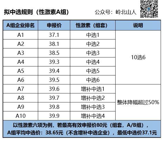 对于A组而言,80元的最高有效申报价,最高申报价为39.9元,整体降幅超过50%,则确定能中选。区别在于,用28进17规则,10进6,则A1-A6直接入选,后四家由于整体降幅超过50%,则A7-A10增补为中选企业。