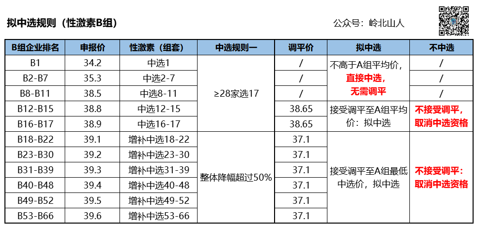 首先,拟中选的17家中,B1-B11申报价低于A组平均中选价38.65元(平均中选价不包含增补中选企业),则直接中选,无需调平