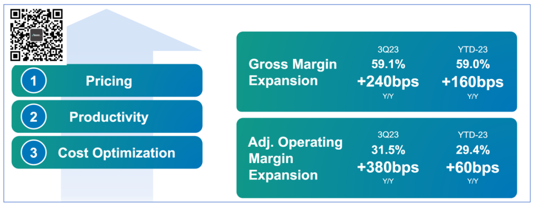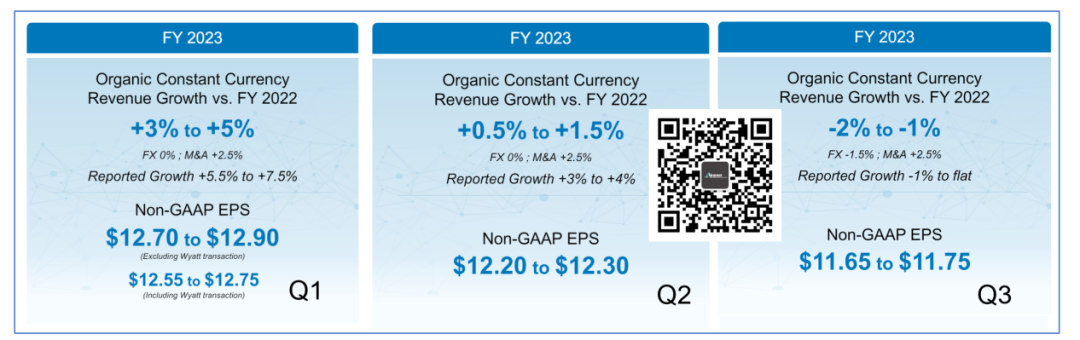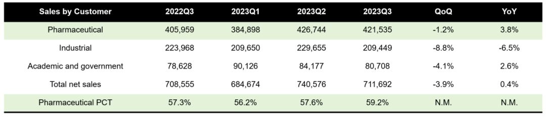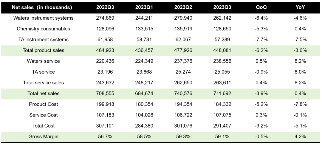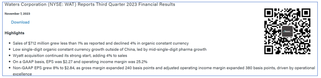 以前学校的分析室有三个大宝贝,年轻的我甚至不允许近距离触摸。 因此,他们是什么也只能听老师讲解了解个大概。 只是,那三个Logo至今记忆犹新: Waters、Shimadzu和Agilent。 必须要承认的是,时至今日,除了工作上的需要跟Agilent还在打交道还算熟悉以外,其他两家已经接触甚少。 因此,今天要聊的Waters也注定浮光掠影,欢迎大佬斧正。 勉强打平 2023年11月7日,科学仪器设备公司Waters(沃特世)公布了2023Q3财报。 本季度营收7.12亿美元,同比增长0.4%。 勉强算是收升了,但是真的很勉强。 不过,并非没有好消息。 公司的毛利率得到了显著的提升,从去年同期的56%左右,提升到如今的59%。 而且,这个趋势是稳固的,整个2023年毛利率都稳定在59%左右,证明了采取的措施有效性。 这一点,公司在财报ppt上也着重指出来,是由于成本优化、效率提升和价格提高造就的。 从数据上来看,Waters很实在,确实是这样。 通过对客户群分析可以看出来,Waters的药企客户重回增长,同比增长达到3.8%,从趋势上来看,也保持了稳定。 但是工业客户情况就不那么乐观了,同比环比均出现了下降。 相对来说,科研和政府业务虽说同比是增长,但是2023年前3个季度均持续下降趋势,并不是个好现象。 那么,是什么让Waters的财报不那么好看呢? 怎么走都是向上 “看起来,都怪中国区不给力。” 别急,这话不是Waters说的。 只是,从目前的数据来看,中国区的销售压力不容乐观。 在剔除中国区数据后,2023Q3 Waters的药企业务取得了5%的同比增长,且总的营收也是增长了2%,不优秀,但是增长了。 如果把中国区数据加回来,就没那么美妙了,总营收出现了4个点的下滑。 果然,还得看我大中华。 我们把分区数据拿出来仔细看下,会发现中国区的情况说不容乐观都有点保守。 2023Q3中国区营收出现了27.7%的大幅下滑。 而且,环比也出现了11.2%的下滑。 而且,2023前三个季度每个季度都在下滑。 你看亚洲其他区也下滑了,但是只有个位数,而且Q2还雄起了一把。 不能比,根本不能比啊。 此时,我想起了一位故人。 不过,说起来,庆总目前的状况应该跟Illumina现任CEO Jacob类似。 “已经到谷底了,怎么走都是向上。” 难就对了 最后,让我们欣赏下Waters的全年财务指引。 让人瞠目结舌的是,2023Q1的时候,公司的营收指引还是全年营收增长5.5%-7.5%。 而到了2023Q3,则是-1%或者持平。 难么?很难。难就对了! 不光Waters难,我们此前聊过的Agilent也难。 这安捷伦2023前三个季度的全年财务指引放这里,我都不用说哪个是Q1/Q2/Q3,大家也能一眼看出来。 就大哥别说二哥吧,共渡时艰了。 稍显不同的是,安捷伦中国区的业务更为惨淡点。 写到这里,我有一个疑问,到底是中国区不行了还是Waters/Agilent的中国区不行了呢? 看了下国内上市的两家典型公司聚光和禾信的三季报,营收分别是8.5亿和9166.6万元人民币。 其中禾信更是同比飙升120%以上,谱聚按理说不会比禾信更差,3位数的同比增长可以期待。 难道质谱/色谱仪器国产替代真的春天来了? 而根据产业链的反馈,在工业端诸如聚光旗下的谱聚产品还真用的不错。 看来,国外品牌怎么走都是向上的推论还是说早了... END |