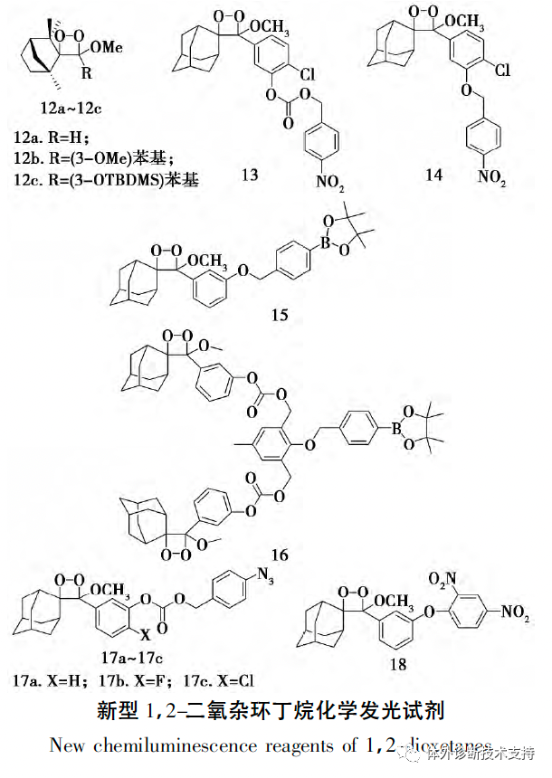 1,2-二氧杂环丁烷类的发光研究已经获得了广泛应用。像AMPPD 试剂采用微粒子化学发光技术,用最新磁性微粒包被抗体,用碱性磷酸酶( ALP) 标记抗原( 抗体) 。经过抗原抗体反应,碱性磷酸酶结合在微粒子上( 碱性磷酸酶的结合量同病人血清中的待测物质成比例) ,反应管两边有磁场,磁性微粒包被的抗原抗体结合物被吸附在管子两边,其他游离部分被抽吸掉。最后加入发光底物,通过光电倍增管检测反应的发光强度。此外,CSPD 和CDP-Star 也是继AMPPD 之后合成出的化学发光试剂,其性能更优于AMPPD。 新型1,2-二氧杂环丁烷类化学发光试剂由于1,2-二氧杂环丁烷的化学发光非常高效,近年来,各种新型的二氧杂环丁烷发光试剂成为研究的焦点。1,2-二氧杂环丁烷一般含有金刚烷酮基团,而Ciscato 合成了含葑基的1,2-二氧杂环丁烷(12) ,研究发现含葑基的1,2-二氧杂环丁烷同含金刚烷酮的1,2-二氧杂环丁烷化学发光性质相似。随着纳米颗粒在新型化学发光免疫分析法中的迅速应用,使其检测效率得到有效提升。因纳米颗粒具有量子尺寸效应、表面效应、小尺寸效应、量子隧道效应等优点而被广泛地用于 CLIA 领域。磁性纳米颗粒(magnetic nanoparticles,MNPs)是一种在纳米尺度上的磁性物质,粒子大小一般为10~100 nm,由多种金属元素和磁性氧化物构成,其主要核心为氧化铁。MNPs 具备良好的超顺磁性,较高的比表面积、生物相容性和低毒性,且可修饰功能基因与多种生物功能分子结合。Liang建立了基于金涂层磁性纳米颗粒(Au-MNPs)的直接竞争性化学发光免疫分析法,用于氯霉素(CAP)的快速分析,相比ELISA 更灵敏。目前,MNPs 在癌症治疗诊断学、生物传感、催化、农业和环境等专业领域得到了广泛应用。金纳米颗粒(gold nanoparticles,AuNPs)是尺寸为 1~100 nm 的微小金颗粒。AuNPs 具备独特的光电和物理化学特性,化学性质稳定,生物相溶性良好,表面易与生物分子结合。自2005 年以来,AuNPs 被认为是液相CL 反应中的潜在催化剂,可用于细胞检测、药物合成及光化学治疗方面。 化学发光免疫分析法具备特异性强、灵敏度高、操作方法简单、通量高及自动化程度高等优点,在人类医学领域应用非常广泛,现已逐渐成为替代酶免法、放射免疫法以及荧光法检测技术的主要趋势。但它在动物生产领域检测上的应用仍处于发展阶段,检测过程中存在仪器故障率较高、试剂稳定性差、本底高等缺点。随着磁性纳米颗粒、金纳米颗粒等新型材料的广泛应用,以及与高效液相色谱、流动注射、微流控芯片等新型技术的联用,加速了该方法在动物生产领域检测中的应用。同时随着磁珠分离技术、单克隆技术以及化学发光能量转移的均匀免疫分析技术的迅速发展,CLIA 将向便捷式、高通量、全自动方向前进。