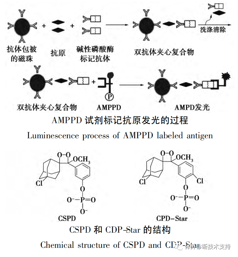 根据化学发光体系中发光剂的不同,可将该方法大致分为三类:直接化学发光免疫分析法、化学发光酶免疫分析法和电化学发光免疫分析法。直接化学发光免疫分析法是利用化学发光标记物对抗体或抗原标记的一种新型检测手段。目前常用的化学发光标记物有鲁米诺类和吖啶酯类,鲁米诺类的标记物不宜直接进行标记,需利用某些化合物对鲁米诺的增强或抑制作用进行直接测定。直接化学发光免疫分析法具有以下优势:背景发光值低、发光反应中干扰因素少、易与蛋白质联结且光子产率不变及标记物稳定。但是,该方法的灵敏度比酶促反应稍低,且发光的持续时间较短。因此,检测过程中对小分子抗原的检测多采用竞争方法,而对大分子抗原的检测多采用夹心法,目前在免疫测定中得到了广泛的应用。化学发光酶免疫分析法(chemiluminescent enzyme immunoassay, CLEIA)是一种通过抗原或抗体上标记的酶与发光底物相互作用产生光子信号的检测方法。通常辣根过氧化物酶(horseradish peroxidase, HRP)与碱性磷酸酶(alkaline phosphatase, AP)是CLEIA方法中最常见的两种酶标记物。它们分别有相对应的发光底物,HRP 发光底物常选择鲁米诺而AP 则选用AMPPD。CLEIA 的优点为:灵敏度高,酶标记抗原或抗体结合稳定,发光持续时间长,便于记录和测定;缺点在于反应速度慢,表面积低、酶容纳量小。但随着纳米材料和催化剂的应用,扩大了固相载体的表面容积,从而提高蛋白与酶的结合量,实现信号放大,提高了CLEIA 的灵敏度和检测效率。实际检测中,CLEIA适合对大量复杂样品进行检测,但也存在样品需求量大、试剂成本高等问题。