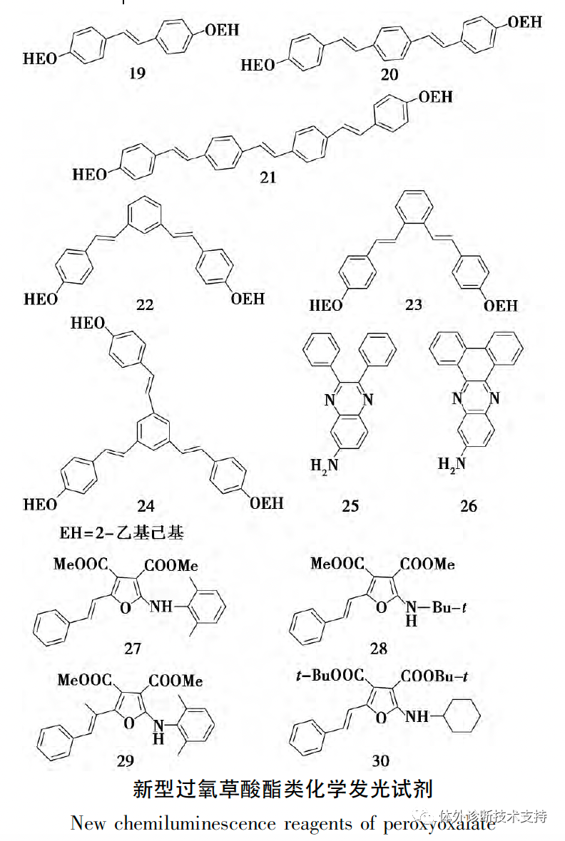 电化学发光免疫分析法(electrochemiluminescence immunoassay, ECLIA)是基于化学环境中光发射原理来检测和分析不同的蛋白质和生物分子,通过化学发光剂三联吡啶钌[Ru(byp)2+3]标记抗原或抗体,同时以三丙胺(tripropylamine, TPA)作为电子供体,经过电场中的电子传递作用,使其产生化学发光的检测方法。ECLIA 具有许多优点,与化学发光(chemiluminescence,CL)法相比,ECLIA 更具选择性,可以通过改变电极电位来选择性地控制激发态的产生;与光致发光(photoluminescence,PL)法相比,ECLIA 不需要光源,能有效降低光散射及发光杂质等问题;与电化学方法相比,ECLIA 具有较高的选择性和较少的电极结垢等优势[8]。而在临床检测中,由于电化学活性材料的干扰以及被吸附蛋白膜污染等因素,也会影响到检测结果。ECLIA 非常适用于小剂量样品的检测,不容易受样品中存在的溶血或浑浊沉淀物的干扰,易实现自动化。鲁米诺(Luminol)其结构简单、易于合成、性质稳定、无毒、环境友好、水溶性好,是应用最多的化学发光试剂之一。CAS号: 521-31-3 鲁米诺Luminol鲁米诺的化学发光性质最早于1928年被 Albrechi HO发现,他发现鲁米诺在碱性溶液中,加入过氧化氢可观测到微弱的发光现象,在此基础上加入适当的氧化剂和催化剂,可以大大提高其化学发光强度。过氧化氢酶、辣根过氧化酶、铁盐、锰盐、过渡金属离子、氨基配合物等均可以作为催化剂或氧化剂增强鲁米诺的化学发光,因此,根据化学发光检测分析的原理,由于上述物质影响了鲁米诺的化学发光速率,并进而影响其化学发光强度,使得鲁米诺可以用于上述物质的分析检测。鲁米诺、异鲁米诺(lsolumino1)及其衍生物是最早在CLIA 中使用的一种常用的化学发光物质。鲁米诺类物质的发光为氧化反应发光。在碱性溶液中, 鲁米诺可被许多氧化剂氧化而发光, 其中H2O2 最为常用。早期的鲁米诺体系主要用于无机物、有机生物小分子的测定, 但由于标记后发光强度降低而使其灵敏度受到影响。20 世纪80 年代, 人们发现发光体系中加入某些酚类及其衍生物、胺类及衍生物及苯基硼酸衍生物对该体系的发光有显著作用, 在这些称作增强剂的物质作用下, 鲁米诺的发光强度可被提高1000倍, 并且氧化剂与发光剂等单独作用时出现的“本底”发光显著降低, 发光时间也得到延长。这些增强剂的使用使得该体系在蛋白、核酸分析领域得到广泛的应用。鲁米诺的化学发光机理通常被认为已经被研究得比较透彻,但实际上,其被氧化中间产物还没有得到统一的结论,只是确定了其最终发光的物质为氨基邻苯二甲酸盐离子。鲁米诺的化学发光机理如图所示。常见的鲁米诺发光试剂包括有异鲁米诺异硫氰酸酯(ILITC)、N-( 4-氨基丁基) -N-乙基异鲁米诺(ABEI )以及4,5-二氨基邻苯二酰肼(DPH)等已经应用于很多领域。因为含有鲁米诺部分的发光试剂发光强度低而且合成困难,所以相关新型衍生物的报道不太多。而近几年该类新型衍生物发光试剂的研究趋势主要有两种:一种是在原有发光试剂的基础上进行相关的结构改造,以发现更优越的发光试剂。Palmioli 以ABEI 为基础进行结构改造,合成了一个呈大环内酯结构的新型异鲁米诺发光试剂ABEI 大环内酯(1) 。对比一般的等价试剂,发光试剂1具有更好的稳定性和反应性,而且合成路线简单高效。另一种是将不同的芳香环引入鲁米诺的氨基位置上,增加其化学发光强度进而获得新型鲁米诺衍生物。Deshmukh合成了含有羟苯基苯并咪唑部分的鲁米诺衍生物(系列化合物2、3) ,研究者另两篇文章又报道了含有苯并吡嗪或单偶氮单元的新型化合物(系列化合物4-7)。同时还研究了这些衍生物在过氧化氢、氰铁化钾及氢氧化钠溶液里面的化学发光特性,发现新型衍生物优于标准的鲁米诺和异鲁米诺体系。预测这些衍生物很有可能会是化学发光探针的候选者。4.2 吖啶酯类(actidinium ester)吖啶酯是一类重要的化学发光试剂,具有较高的量子产率,其化学发光效率较高,通常是鲁米诺的五倍或五倍以上。除此之外,吖啶酯的化学发光过程反应迅速,本底低,在氢氧化钠和过氧化氢的存在下即可发光。在氧化反应过程中,结合物被分解,不影响游离吖啶酯的发光;另外,吖啶酯类化学发光试剂具有较好的稳定性,易于储存。吖啶类是一种量子产率非常高的化学发光试剂,其分子结构至少由两部分组成: 发光基团(emitter) 和离去基团(leaving group) 。应用最广泛的是吖啶酯和吖啶磺酰胺,图中R、R'、R″为烷基、烷氧基及芳基等其他取代基; X、X'、X″为偶联基团,用于偶联抗原或抗体,并增加化合物溶解性取代基 R1、R2、R′、R′′的吸电子或供电子性以及它们的体积会影响过氧化氢阴离子HO2−亲核进攻吖啶酯9位羰基的能力,进一步影响吖啶酯的化学发光动力学,量子产率和其它方面的性质。取代基 R1的电性是化学发光动力学的决定性因素,例如离去基团上无取代基时(R1=H),化学发光过程持续约 1秒左右;由 2′5-二甲基,或 2′6 二甲基取代时,化学发光过程持续约 3 秒左右,被延缓;当离去基团上由 2′6 二溴取代时化学发光过程被加快,约 0.7 秒完成;当离去基团上有 2′6 二硝基或三氟甲基取代时,由于吸电子性更强,发光过程更快,约0.5 秒完成。取代基的位置还会影响吖啶酯的水解稳定性,2′6 位取代基由于引起位阻效应而使吖啶酯稳定性增强,可以预见体积较大的取代基引起较强的空间位阻