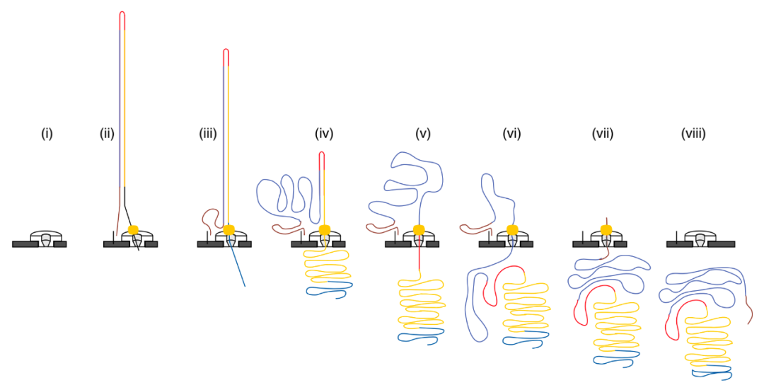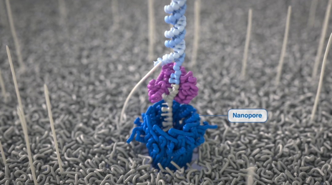 长读长、无需扩增、单分子实时测序,是SMRT测序和纳米孔测序共有的特征。但后者似乎更新潮,也更符合人们对未来测序技术的想象。 不同于SMRT技术,其只是跳出了链末端终止法的框架,纳米孔测序几乎完全摒弃了旧的“话语体系”——它从光的语言(荧光检测),转变成了电的语言(电信号检测)。我在前一篇文章里提到,可以想象测序仪中存在一双眼睛,由它来阅读由A、T、C、G四个字符写成的基因组之书。在纳米孔测序仪中,纳米孔就像是那样的一双眼睛。所谓的纳米孔,指的是纳米尺寸的孔状结构。和零模波导孔ZMW不同,它是两端贯通的孔洞。可以是生物纳米孔,也可以是固态纳米孔,或者是将蛋白质孔集成到固态膜上的混合纳米孔。纳米孔测序的头号公司Oxford Nanopore Technologies(以下简称ONT)的第一代技术采用的是α-溶血素一类的蛋白质纳米孔,内径为1 nm,与单个DNA分子的尺寸相当。此类纳米孔在细胞膜上天然地存在,作为离子或分子进出细胞的通道。未来则可能使用氮化硅、石墨烯等材料的固态纳米孔。  这些纳米孔分布在一层高电阻率的聚合物膜上。膜的两侧是两个充满电解液的腔室。由于核苷酸分子本身带有负电荷,它们会从阴极一侧,流向阳极一侧,从而穿过纳米孔。当DNA/RNA链从纳米孔中穿过时,纳米孔也在“阅读”这条链。链上的每个核苷酸在占据纳米孔的那一刻,对离子电流产生阻断效应。而由于不同的核苷酸在尺寸、空间结构上存在差异,相应地,在通过纳米孔时产生的离子电流的变化是不一样的。也就是说,每种核苷酸都有其特征性的电流变化,如同独一无二的指纹。因此,实时监测并记录某条DNA/RNA链通过纳米孔的电流变化图谱,可以回溯、推断出核苷酸顺序,从而实现单分子测序。如上图所示,纳米孔测序过程犹如穿针引线。就像线离不开针的固定和导引,核苷酸链从纳米孔中step-wise地、逐步地穿过时,离不开相关蛋白质和酶的辅助和控制。其中最关键的可能是分子马达(Molecular Motor),或称马达蛋白(Motor Protein)(图中的黄色斑点)。它具有解旋酶活性,使DNA双链或DNA-RNA杂交链解离为单链,牵引单链穿过纳米孔,还能调控穿过时的速度。核苷酸链在纳米孔中逐个穿过的过程被称作易位(Translocation),步骤很简单:先导接头、模板链、发夹接头、互补链、尾部接头依序通过。其中发夹接头把两条链接续起来,允许模板链和互补链的连续测序,相当于把一条序列测了两遍,是纳米孔测序中的2D读取模式。1D模式下则采用普通的接头(为了提高通量而牺牲一部分准确率)。也许就是因为采取了电信号检测而不是荧光检测方式,纳米孔测序仪可以做得比常规测序仪更小巧、便捷。2014年4月,ONT公司向一部分抢先体验的用户推出了世界上首款纳米孔测序仪,MinION,并在2015年将其商业化。这台测序仪就如同它的名字一样迷你,仅手掌大小,重量在90 g左右。用于信号检测的膜片钳放大器被压缩、集成到了专用集成电路(Application-Specific Integrated Circuit, ASIC)上。所以它比一部手机大不了多少。这也让纳米孔测序仪更具有未来感。试想一下,当测序仪变得像耳温枪、血糖仪一样小巧、便宜,家家户户都可以备一台,那岂不是很方便?孕妇不必去医院做无创产前检测(检测胎儿是否患有染色体非整倍性检测,如21-三体综合征),自己扎一针,用测序仪对含有胎儿游离DNA(cffDNA)的血液测个序就行了。癌症则可以对血液中的循环肿瘤DNA(ctDNA)测序。尽管现在听起来有点天方夜谭,但我们不应缺乏想象。当世界上首台计算机问世时,那个30吨的大家伙对于普通人来说遥不可及。而现在遍地是电脑,人人手持一部手机。突出的便携性,以及即时性(测序速度很快),使之与POCT(Point-of-Care Testing)的调性很搭。它非常适用于一些需要现场即时分析的场合。例如,MinION测序仪曾被带去非洲西部,对埃博拉病毒患者进行测序。埃博拉病毒的确认仅需15分钟的仪器运行时间。NASA曾在微重力条件下对MinION进行试验,并将其带去国际空间站。因为MinION足够地小,在失重条件下也容易控制。小型化是测序仪发展的必然趋势,但前提是无损于测序性能。独特的基于电信号检测的测序方式和异于普通测序仪的便捷性,使纳米孔测序技术被寄予厚望。这种“厚望”可能还比人们对SMRT技术的期望更“厚”一些。甚至还出现了一个说法,将纳米孔测序与SMRT测序区分开来,单独归在“第四代测序技术”一类。纳米孔测序的长读长优势更显著,在长读长模式下为10-100 kb,超长读长测序模式下则达到100-300 kb,最高记录为2.3 Mb。但它的测序准确率一般低于SMRT测序。稍微想想,就能知道高准确率的纳米孔测序实现起来有多么困难。核苷酸链在纳米孔中的易位速度极快,电流变化极难捕捉,必须千万次地优化纳米孔的设计与修饰以及马达蛋白,减缓易位速度,才能得到可辨认的电信号谱图。而不同核苷酸产生的离子电流变化又是极其微小,如何根据这种微小的变化将它们区分开来,也是一大难题。可以说,纳米孔测序更特别,与NGS的距离更远。研究人员们通常将其与NGS结合使用,利用其在长读长上的优势,拓宽基因分析与生物学研究的边界。目前,对于不同的测序技术,一个普遍的共识是:没有最好的测序技术,只有最适合的技术。对于纳米孔测序,想象中的美好未来还没有来,但值得期待。[1]https://nanoporetech.com/platform/technology[2]Jain, M., Olsen, H.E., 