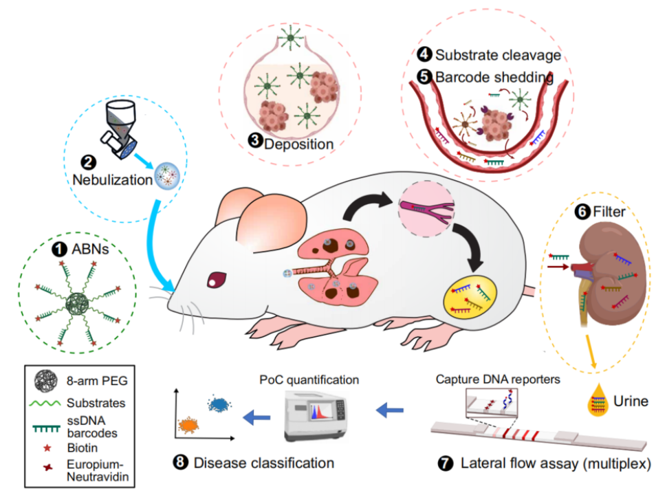 肺癌是一种恶性肿瘤,主要类型包括非小细胞肺癌和小细胞肺癌。根据世界卫生组织(WHO)的数据,肺癌是全球第二常见的癌症,且是癌症死亡的首要原因。每年约有220万新发病例和180万相关死亡。在发达国家,由于早期诊断率高、治疗方案佳,因此肺癌死亡人数持续下降。无论国内外,数家企业正在或者已经将成熟的肺癌早筛试剂盒投入市场。 知名多组学癌症早筛公司Freenome于十二月初宣布启动一项名为PROACT LUNG的新研究,来验证其肺癌癌症筛查血液测试的临床效果,若成功则将申请FDA验证。 中低收入国家的肺癌死亡率一直居高不下,这可归因于在资源贫乏的环境中早期诊断机会的不平等。基于此背景,更加简便且灵敏的肺癌早筛技术始终是行业研究热点。近日,麻省理工大学团队开发了一种用于早期肺癌诊断的新型液体活检技术,可以通过检测尿液中与肺癌相关的蛋白质来判断患者是否罹患肺癌。其核心是合成了一种可吸入的纳米颗粒传感器,受试者首先吸入这些纳米传感器,如果传感器在肺部遇到与癌症相关的蛋白质,它们就会产生信号,并在尿液中积累,可以用简单的纸质测试条检测到,20分钟内即可出具结果。本项研究主要的工具为一特制传感器。该传感器由涂有报告基因(例如DNA条形码)的聚合物纳米颗粒组成,当传感器遇到蛋白酶时,报告基因就会从颗粒上裂解下来,而蛋白酶在肿瘤中通常过于活跃。这些掉落的结合物最终会积聚在尿液中并排出体外。 为了让纳米颗粒进入肺部,研究人员创建了两种颗粒配方:一种可以雾化并用喷雾器输送的溶液,以及一种可以使用吸入器输送的干粉。一旦颗粒到达肺部,它们就会被吸收到组织中,并在那里遇到可能存在的任何蛋白酶。人类细胞可以表达数百种不同的蛋白酶,其中一些在肿瘤中过度活跃,它们通过切割细胞外基质的蛋白质帮助癌细胞逃离其原始位置。这些癌性蛋白酶从传感器上切割DNA条形码,使条形码在血液中循环,直到通过尿液排出体外。研究人员在小鼠身上测试了他们的诊断系统,这些小鼠经过基因工程改造,可以产生与人类相似的肺部肿瘤。这些传感器是在肿瘤开始形成7.5周后施用的,这个时间点可能与人类I期或II期癌症相关。在首轮小鼠实验中,研究人员对20种不同类型的传感器敏感水平进行了研究,这些传感器旨在检测不同的蛋白酶。研究人员使用机器学习算法分析这些结果,确定了仅四个传感器的组合(PLQ38-DNA1、PLQ46-DNA2、PLQ81-DNA3和PLQ83-DNA4),预计可以提供准确的诊断结果。然后他们在小鼠模型中测试了这种组合,发现它可以准确地检测早期肺部肿瘤。虽然在动物实验中效果限制,但是研究人员仍然表示,对于人类来说,可能需要更多的传感器来做出准确的诊断。目前正在计划分析人体活检样本,看看他们使用的传感器面板是否也能检测人类癌症。同时,Sunbird Bio公司已经对Bhatia实验室开发的类似传感器进行了第一阶段试验,用于诊断肝癌和一种称为非酒精性脂肪性肝炎 (NASH) 的肝炎,相信该技术在人类疾病的应用上即将迈上商业化道路。纵观各大癌症早筛公司使用的技术,目前主流的早筛手段都是利用血检这一模式,这强烈依赖于医护采样,患者无法自行操作。并且即使在及其快速周转检测的条件下依旧需要近20小时才能获得结果。而本篇文章中所提到的基于纳米颗粒传感器的尿检新技术,则可以在20分钟内就获得最终诊断结果。尿检的另一优势,还在于样本易获得性与稳定性,患者可以自主完成检验,并且尿液相比于血液更易采集、保存于运输。目前,在癌症早筛领域中,仅膀胱癌这一疾病多采用尿检样本作为检验材料,其他癌种进行早筛时使用的体液大多为血液。在本篇文章中所介绍的研究中,独创性地提出尿检也可应用于肺癌早期诊断,提示了纳米颗粒技术结合尿检技术在不同癌症早筛中的巨大潜能。目前,已有如诺辉健康的宫证清尿液HPV检测试剂盒等大企业已经在采用尿检的方式进行疾病筛查与早诊。相信随着尿检在肺癌以及其他癌症早筛技术中的发展,全球范围内癌症早筛的技术选择也将越来越多,更多的产品也将迎来上市,为患者带来福音。