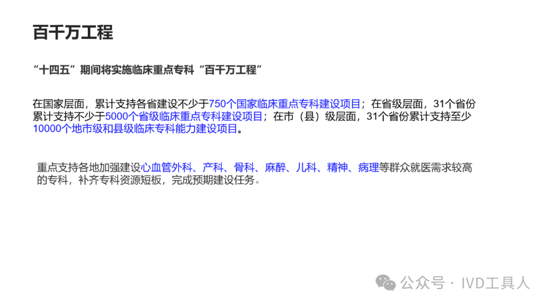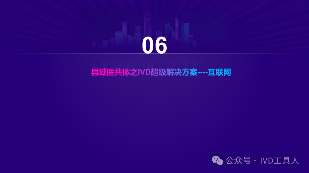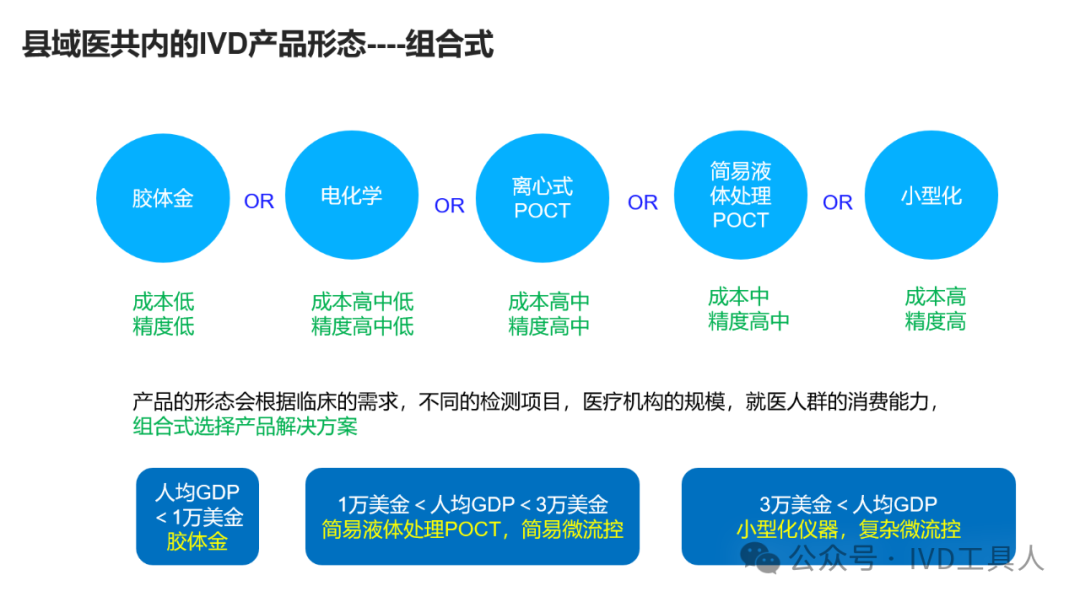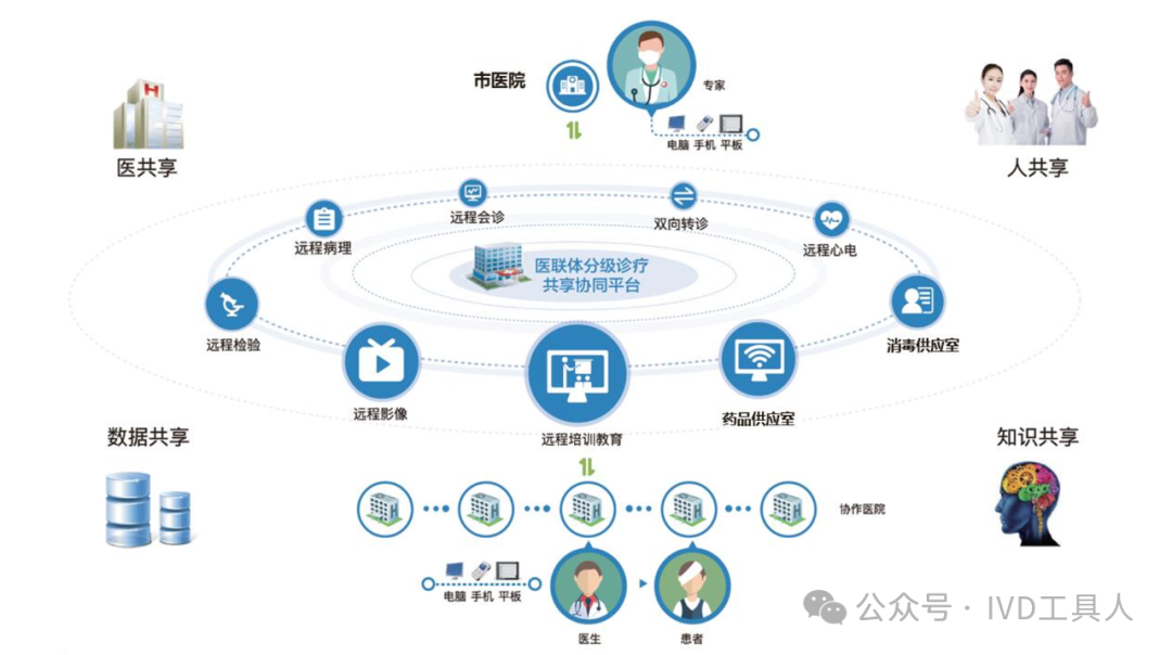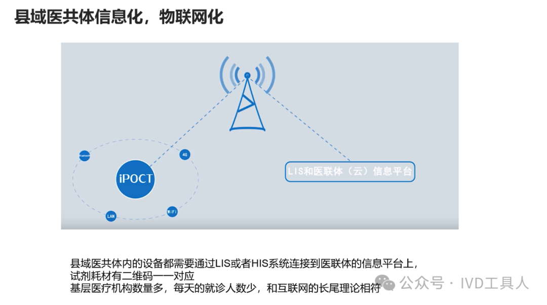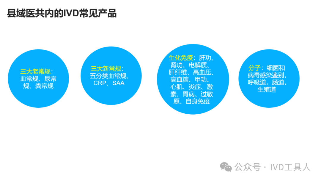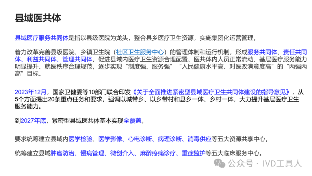 创新,革命老产品,重新划分存量市场,最难!物理化学生物各个学科的底层技术没有突破,在诊断上就更难有创新。AI的应用,不知道是否可以引起IVD的革命,可能在图像分析,联合指标分析等方面上会有广泛应用。 出海,与欧美产品一较高下,在国内主场还没完全打赢,去客场打,难度可想而知。率先要去争夺的还是亚洲,中东,非洲和南美。拿下第三世界的医疗,走农村包围城市的路线。下沉,挖掘县域医疗的需求。一线企业也在下沉,留给中小企业的机会也不多。但是县域医疗是个辛苦活,利益分割地比较散,山高皇帝远,一个地方有一个地方的分配格局,厂家和经销商还是可以努力一下。但是财政改革,城债出清,也要从县域开始,不知道对医共体建设是否会有影响。本文将梳理,对于县域医疗共同体的建设中,IVD企业能做什么贡献,挖掘什么商机。文末留言666,加小编进县域群!