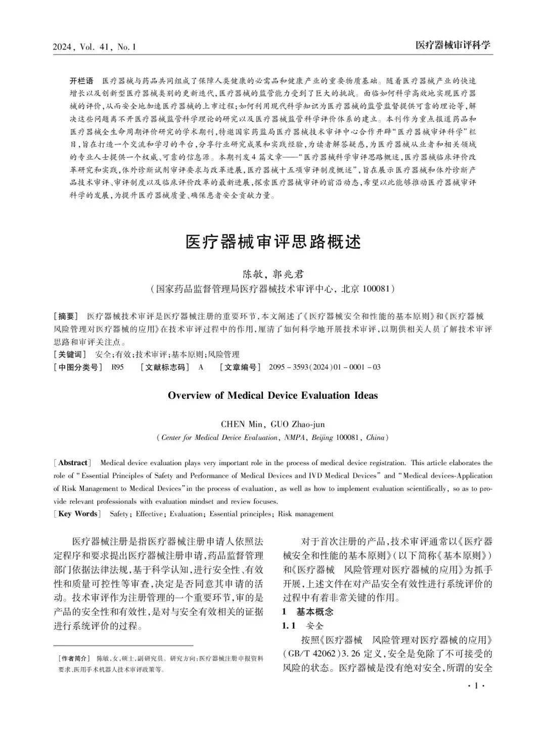 作者:陈敏, 郭兆君 国家药品监督管理局医疗器械技术审评中心 摘要:医疗器械技术审评是医疗器械注册的重要环节,本文阐述了《医疗器械安全和性能的基本原则》和《医疗器械 风险管理对医疗器械的应用》在技术审评过程中的作用,厘清了如何科学地开展技术审评,以期供相关人员了解技术审评思路和审评关注点。 关键词:安全;有效;技术审评;基本原则;风险管理