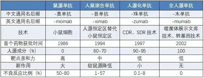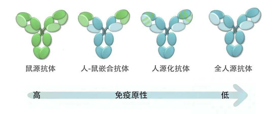 第一个阶段的鼠源抗体免疫原较强,引起机体超强的免疫反应,因此后面的三个发展阶段都是让抗体更加偏向于人源化,尽可能减少免疫反应。