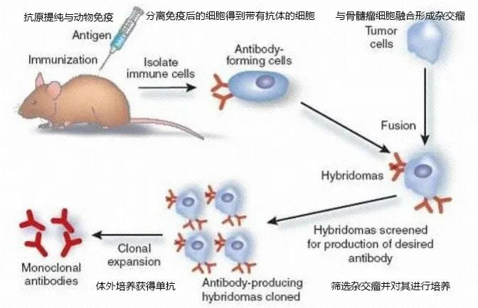 得益于抗体的发现和结构的解析,在1975年,英国科学家Kohler和Milstein以“预定特异性抗体融合细胞的持续培育”为题,首次用仙台病毒使小鼠骨髓细胞和绵羊红细胞免疫的小鼠脾细胞(B淋巴细胞)进行融合,发现形成的杂交细胞既能在体外无限增殖,又能持续的分泌特异性的抗体,通过克隆化的培养可获得纯的细胞,制备得到首个治疗性单克隆抗体-OKT3(Ortholone)开创人类利用杂交瘤技术制造单克隆抗体之先河