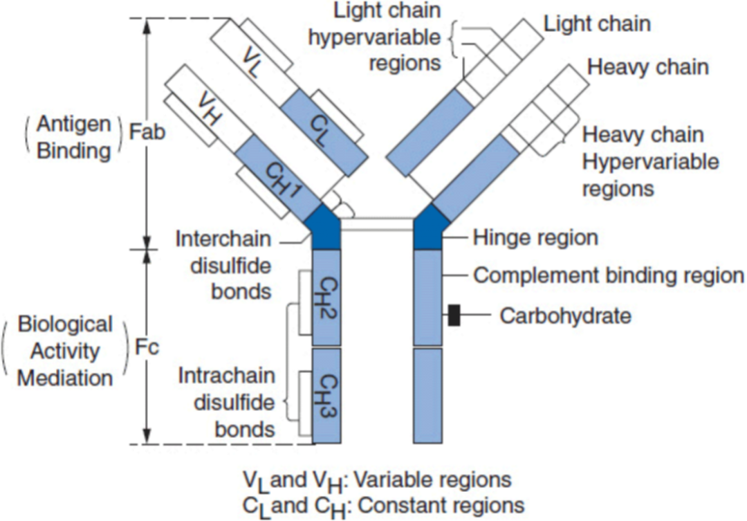 由两条完全相同的重链(H链,氨基酸数目多,相对分子量大)和完全相同的轻链(L链,氨基酸数目少,相对分子量小)组成,链间由二硫键连接。每条重链和轻链分为氨基端(N端)和羧基端(C端),其中重链类型决定抗体亚型。