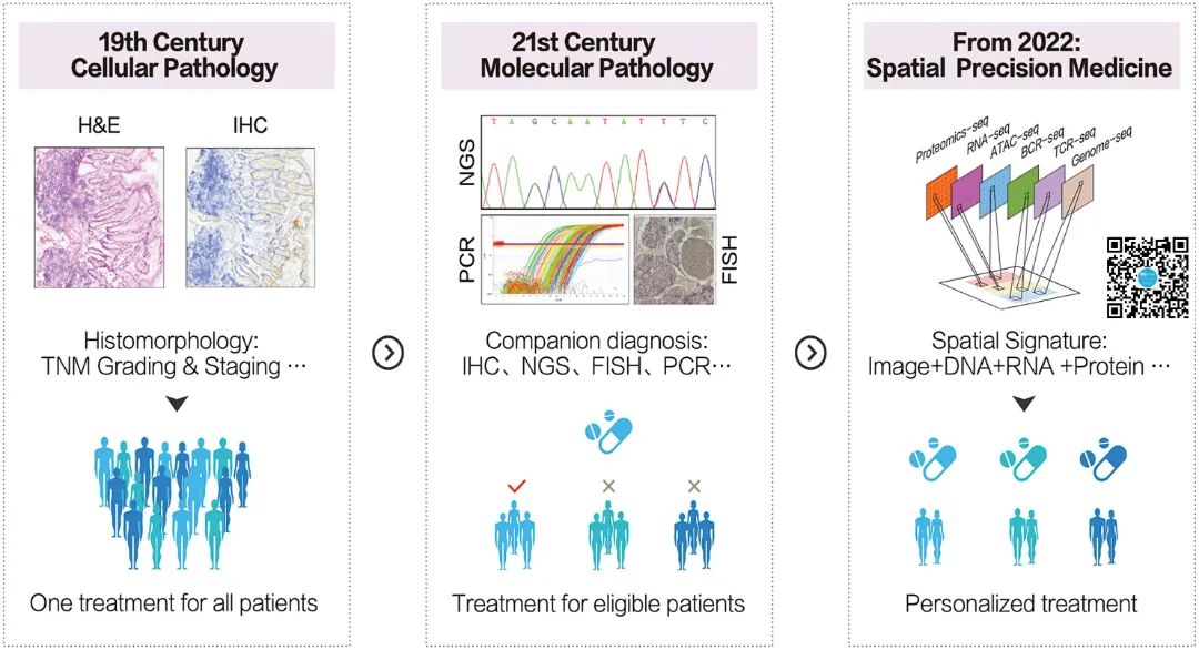 | 各个时期的特色技术发展都会促进精准医疗迈向新的高度,也代表了精准医疗的发展趋势。比如19世纪的细胞病理学(IHC等)、21世纪的分子病理学(NGS等)以及2022年兴起的空间病理学(mIHC/IF等)。