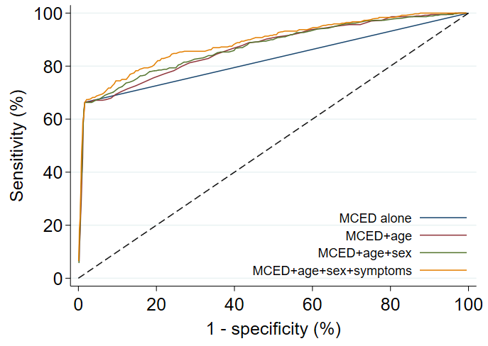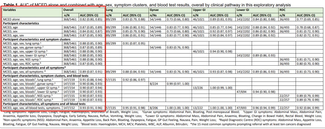 Grail最近在官网更新了几篇在ASCO发表的Poster,其中有一篇是关于Galleri模型的,在此研究一下。 前边曾经写过一篇Grail建模的文章,只使用甲基化特征进行建模,感兴趣的可移步甲基化泛癌早筛—Grail是如何建模的? 此次Grail新模型测试是在临床实验SYMPLIFY基础上进行的,SYMPLIFY是验证Galleri在高风险人群(携带有可能是癌症引起相关症状)中表现的临床实验。 此次模型只测试了第一步的癌症鉴别模型,组织溯源模型未有更新。 在原甲基化模型分值的基础上,测试联合病人的年龄,性别,一堆可能由癌症引起的症状及血常规检测的一些指标。 使用的模型还是逻辑回归,这模型真是无敌了。。明明是很简单最基础的机器学习模型,但是不管泛癌还是单癌都用它。 结果见下表,主要看红框内总的AUC变化: 甲基化模型单独的AUC是0.82。 首先联合最易收集的年龄和性别:加入年龄之后AUC提升到了0.87,再继续加入性别的话AUC还是0.87没再提高。 联合年龄的效果要好于联合性别,这个也说的过去,毕竟甲基化和衰老密切相关,即使训练时做了年龄平衡,也很难完全抹除年龄信号。 然后再联合一堆可能由癌症引起的症状,比如可能由肺癌引起的症状:食欲不振,咳嗽,疲劳,咳血,呼吸急促,体重减轻;上消化道症状: 腹部肿块,腹痛,贫血,食欲不振,消化不良,吞咽困难,恶心,反流,呕吐,体重减轻等。 至于如何将这些症状特征与甲基化模型分值联合,很简单:只能分类的表型标为0或1,能衡量程度的表型使用分数或数字进行表示。 这么多症状也不是全部纳入,至于具体纳入哪些症状,使用了“backward selection”的方法,即后向消元方法,从包含所有自变量的模型开始,使用逐步回归确定一个变量是否应该从模型中被删除,一次只能删除一个变量,当模型中的自变量的p值没有大于α(Grail设置为0.05)时,后向消元过程结束。 说起来费劲,其实有现成的python程序可以实现,从别处找的代码,我还没测试,仅供参考: