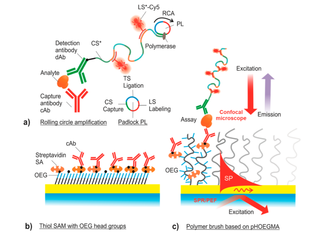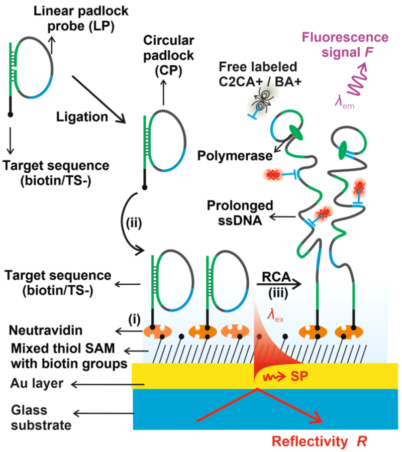 在固体传感器表面进行了三明治免疫RCA的实验,用于单分子水平的蛋白质分析物的检测。通过结合SPR和PEF装置,实时监测生物分子在表面的附着和长ssDNA链的RCA生长,并行测量表面质量密度变化和与荧光团标记分子结合到表面相关的荧光信号。这两种读出模式对发生在非常接近表面的变化很敏感,这是通过共振激发表面等离子体波的受限电磁场(到一个约100 nm的距离)来探测的。