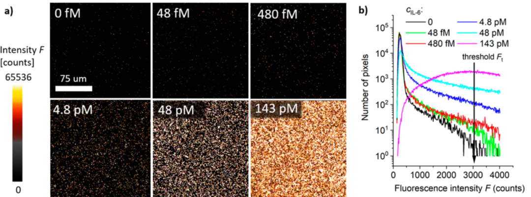 RCA产物的存在表现为荧光强度增加,来源于Cy5-LS标记的ssDNA链与亲和捕获的IL-6分析物连接。成像显示,当目标IL-6分子从低(fM和低pM)浓度的溶液中被捕获时,可归因于单个扩增事件。对于较高的IL-6浓度c > 48 pM,表面可容纳未分离的明亮区域。应该注意的是,对传感器表面的单个IL-6分子进行成像的能力并不意味着报告的概念允许检测分析溶液中分析物的单个拷贝。