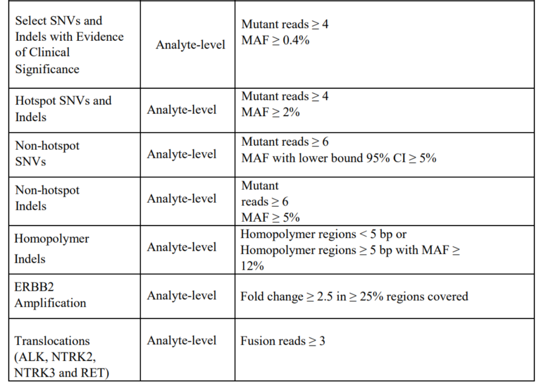 PGDx elio tissue complete的过滤参数:和MSK-Impact类似也是不同的突变设置不同的过滤标准: 有临床意义的突变/热点突变和Indel/非热点SNV/非热点Indel等分别设置不同的过滤标准(Mutant reads相当于上图中的AD,即发生突变的reads;MAF相当于上图中VF,即突变频率): 越是重要的突变过滤标准越低,不过这些位点最后还需要人工IGV审核之后才能报出。 感慨一下:老美真…有钱,产品只要FDA批准不管多贵就能进医保,怪不得FoundationOne和Signatera这么能卖,大Panel上万人民币,WES+定制Panel,两万左右,在美国肯定更贵,全都能报销。。。只看性能,不管价格。 国内不到1千的单癌甲基化早筛试剂盒进医保都费劲,不仅看性能,价格也同样重要,既要又要,哪这么容易。 这会不会引起一个现象:市场上充斥着一堆没经过严格验证的“低价”产品,劣币阻挡了良币的发展?