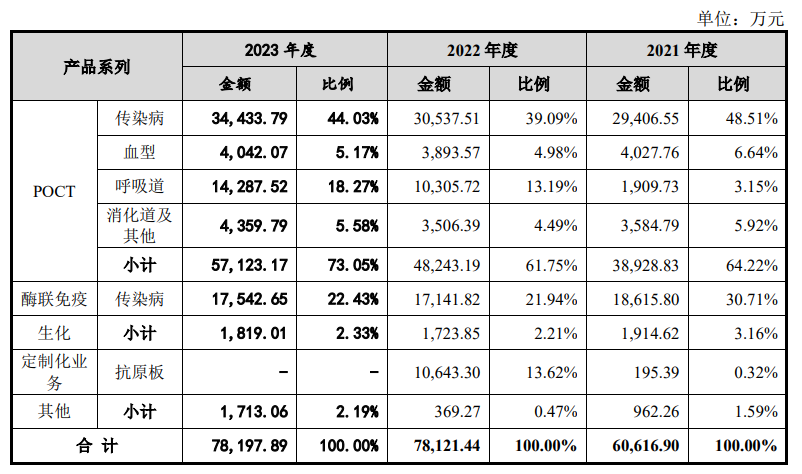 招股书显示,英科新创成立于1989年,是一家专业从事体外诊断产品的研发、生产和销售的高新技术企业。该公司开发出了POCT、酶联免疫、生化等诊断产品技术平台,并形成了以POCT及酶联免疫产品为核心,重点发展生物活性原料、化学发光和分子诊断等产品的业务布局。该公司产品在临床应用上涵盖了传染病、血型、呼吸道、消化道、心脏标志物、优生优育、药物滥用及免疫疾病等领域。