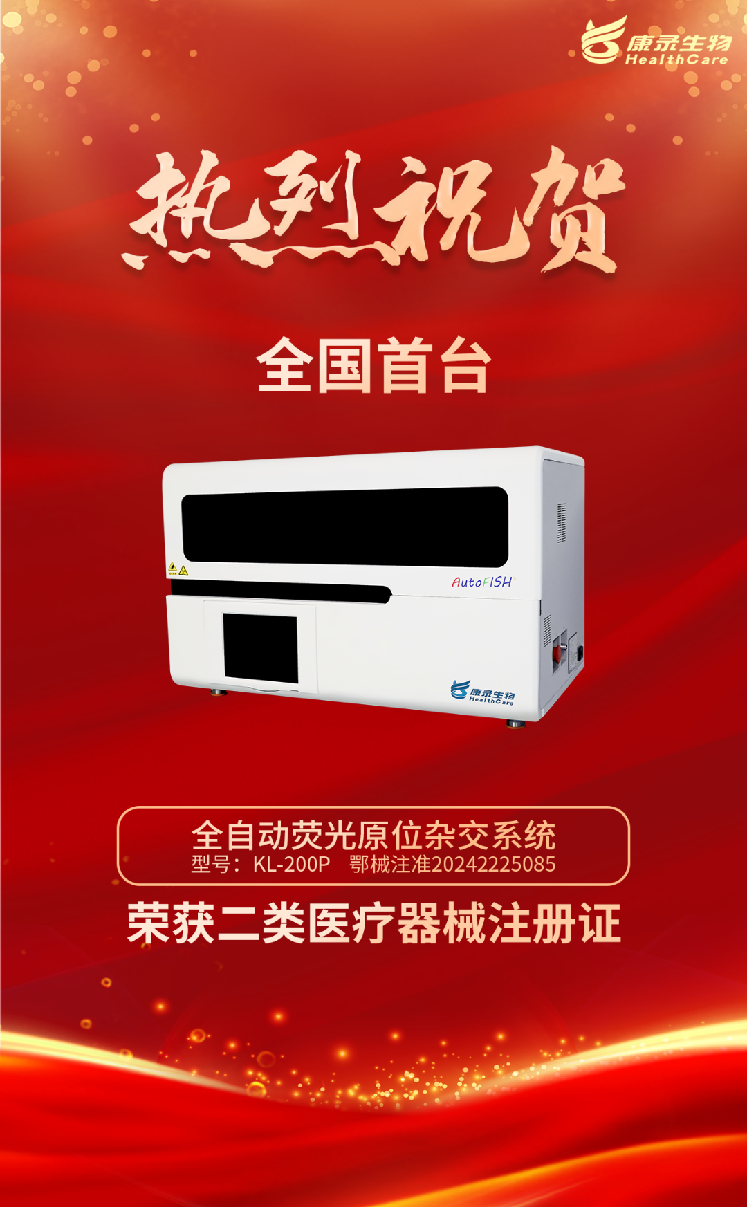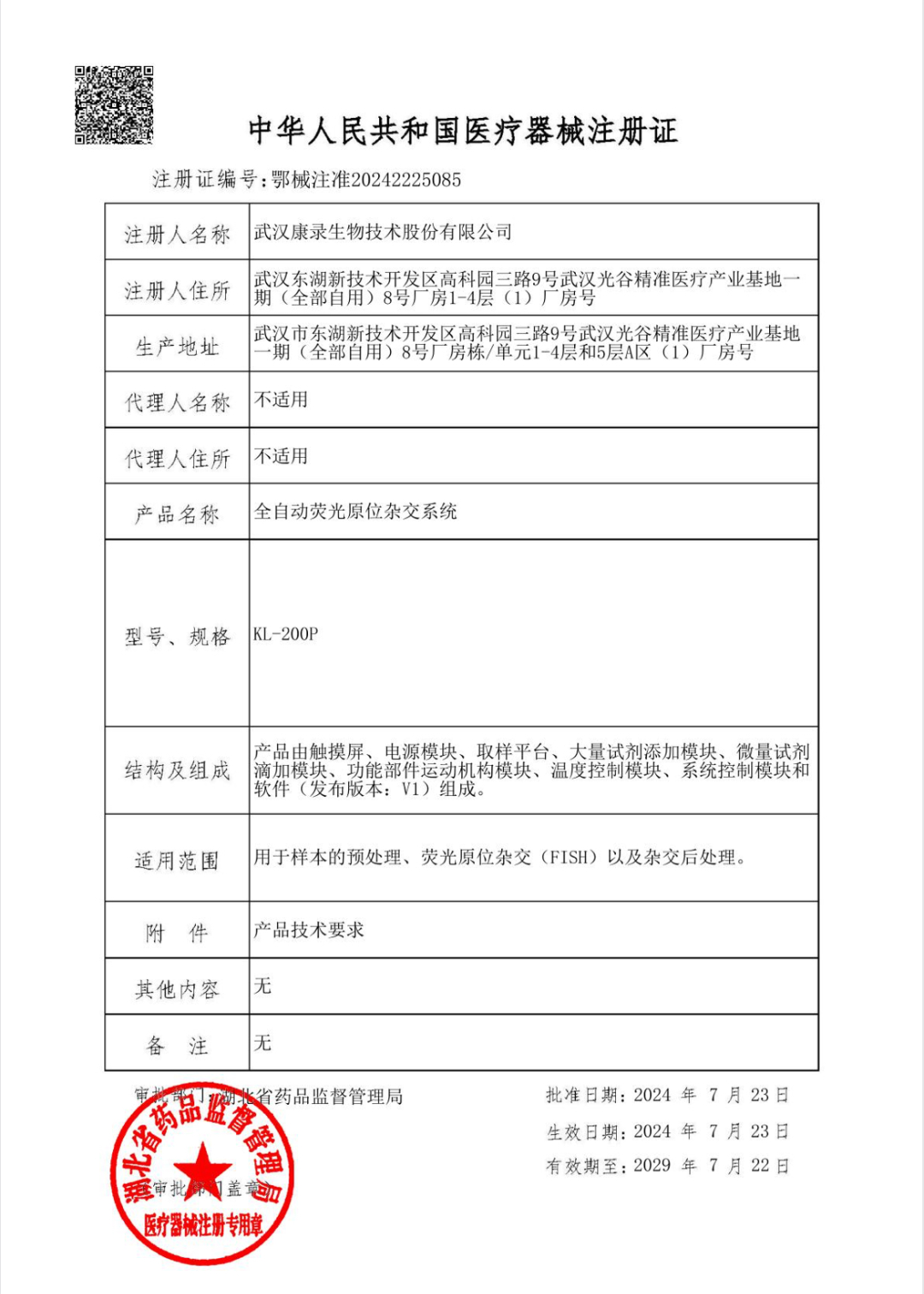 康录生物研发的全国首台FISH全流程自动化的全自动荧光原位杂交系统于2024年7月23日荣获国家二类医疗器械注册证,注册证号:鄂械注准20242225085。