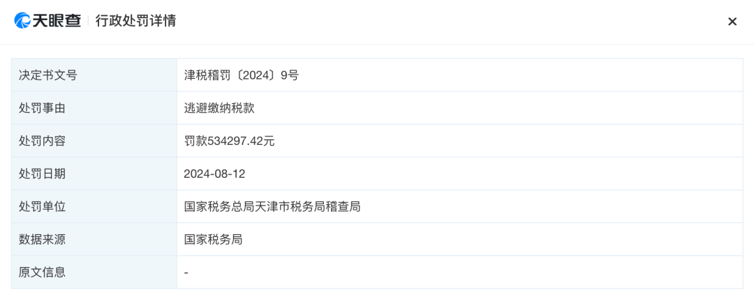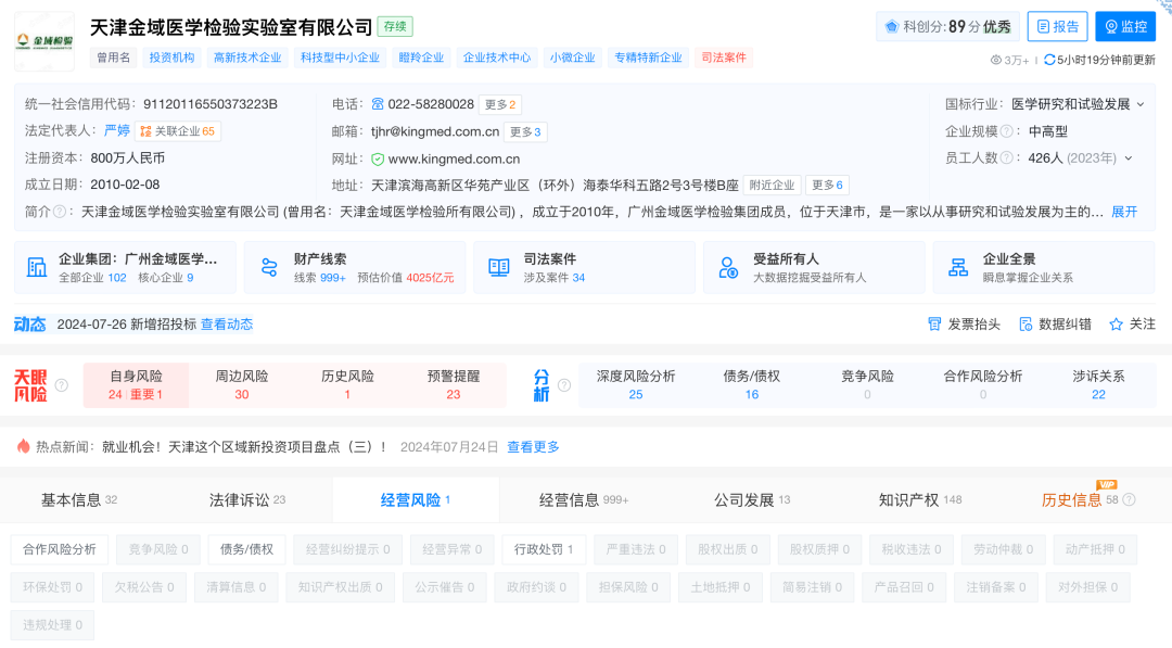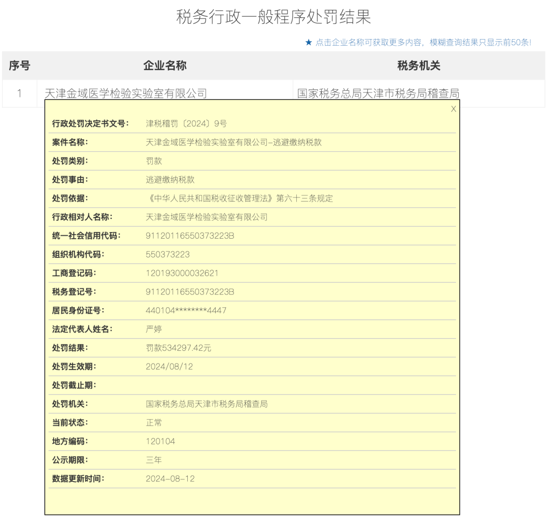 国家税务总局天津市税务局信息显示,近日,天津金域医学检验实验室有限公司因逃避缴纳税款,被天津市税务局稽查局罚款53万余元。