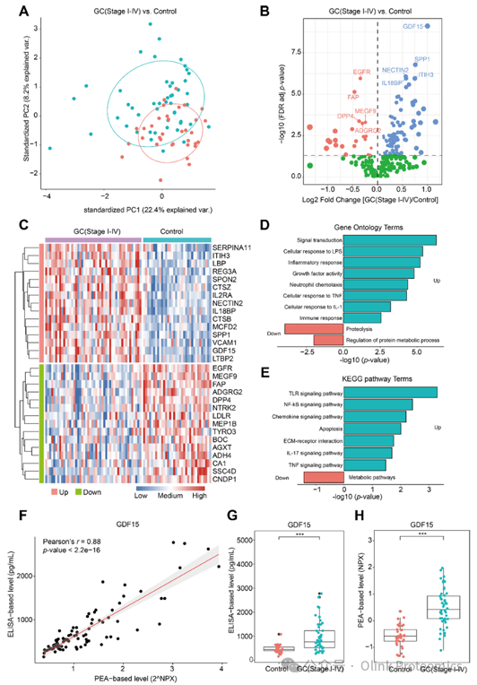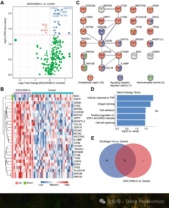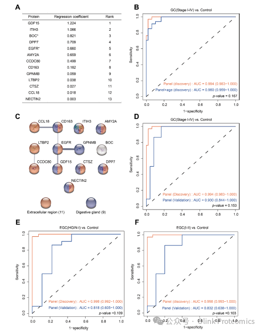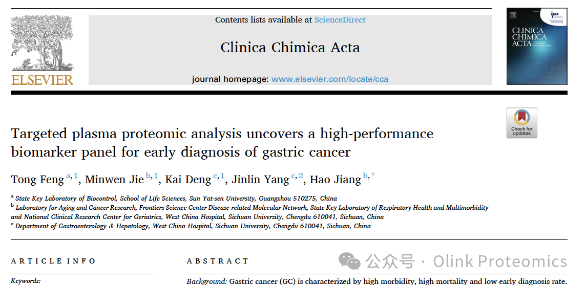 文章速递 研究背景 胃癌(Gastric Cancer, GC)是全球发病率和死亡率较高的恶性肿瘤之一。由于早期胃癌(Early Gastric Cancer, EGC)症状不明显,缺乏侵入性小、方便且有效的方法,导至其早期诊断率较低。然而,早期诊断对于胃癌的治疗至关重要,因为早期胃癌的五年生存率超过90%。传统的胃镜检查虽然是诊断胃癌的有效手段,但由于其侵入性和高昂的费用,限制了其在大规模胃癌筛查中的应用。因此,研究者们一直在寻找非侵入性或微创的早期胃癌检测方法。 研究亮点 研究鉴定出的由13种蛋白组成的panel,在发现队列和验证队列中对于GC和EGC都有较的诊断性能,这些标志物在未来有望助力GC和EGC的临床诊断和新型早筛工具的研发。 研究结果 两个队列被纳入此研究:经过严格的纳入排除标准,最终发现队列一共88例样本(包含34名胃癌I-IV期,和6名癌前病变,以及48名对照组)和验证队列一共50例样本(包含24名胃癌I-IV期,和4名癌前病变,以及22名对照组)被纳入研究。通过Olink Explore 384 Cardiometabolic panel,对血浆样本中的369种蛋白质进行定量。在发现队列中通过LASSO回归模型和Ridge回归模型,筛选出能够区分GC/EGC与对照的蛋白质标志物,并进一步在验证队列中验证其诊断效能,最终得到可靠的GC和EGC的多蛋白分子诊断panel。 为了鉴定GC生物标志物,研究者在发现队列中,利用Olink Explore 384 Cardiometabolic panel,对血浆样本中的369个蛋白进行检测,共367个蛋白纳入后续分析,通过差异分析发现116个在GC组与对照组之间表达水平显著不同的蛋白质(FDR校正p值<0.05)。通过GO和KEGG分析,研究者发现在GC组中上调的蛋白通常富集在炎症和免疫相关的途径上,而下调的蛋白主要富集在蛋白质代谢和代谢途径调控上。为了验证PEA的定量准确性,研究者使用ELISA检测了差异蛋白中显著性最高的GDF15蛋白的表达水平,发现PEA测量的GDF15水平(2^NPX)与ELISA测量的水平之间存在高相关性(发现队列:Pearson’s r = 0.88, 验证队列:Pearson’s r = 0.96) 发现队列中GC患者与对照组血浆蛋白质的变化 为了筛选到EGC标志物,研究者们首先对于EGC的分组进行了定义。尽管之前对GC的部分Olink研究将I-II期作为EGC,但II期患者的5年生存率(>60%)大大低于I期患者(>80%)。与上述两个阶段相比,HGIN患者的5年生存率(>95%)更高,这意味着该阶段的诊断和治疗可能使患者受益更多。同时,由于大多数HGIN表现出与原位癌相似的组织形态学特征,并在4至48个月内发展为侵袭性GC,许多内科医生对HGIN和I期GC患者使用相同的临床治疗原则(如内镜黏膜下剥离术,ESD)。因此,在该研究中,研究者们将HGIN和I期患者作为EGC。通过对发现队列中的367个蛋白进行差异分析,研究者在EGC(HGIN-I)与对照组之间鉴定出27个差异表达的蛋白质。 发现队列中早期GC组与对照组血浆蛋白差异表达的鉴定 GC和早期GC诊断模型构建及验证 研究展望 序祯达生物Olink蛋白质组学平台 2020年,序祯达生物正式引进Olink这一具备高灵敏度、宽动态范围、高通量的蛋白质检测技术,开启蛋白质组学研究之旅。序祯达生物是国内首家可提供Olink Explore HT、Explore、Target、Flex及Focus全套服务的服务商,是国内首家通过Olink Target 48/96、Olink Explore、Olink Explore HT质控标准的一致性验证的服务商,一直以来致力于提供满足国际标准的高质量的检测数据和服务。 序祯达生物介绍 序祯达生物是一家专业提供测序技术服务和多组学研究解决方案的服务型平台企业,总部位于上海自由贸易实验区外高桥保税核心功能区内,中心实验室面积超过3000平方米,拥有大规模的高通量测序平台,提供超过300项符合组学领域专业检测项目。是国内屈指可数的同时获得CLIA、CAP、ISO15189、ISO27001等国际权威认证的测序与组学技术服务商。作为一个致力于提供优质生物技术研究服务的平台,我们支持灵活定制化的开发验证和检测分析服务,为生物医药领域的研究者提供高品质的技术支撑。 在序祯达生物,我们以创新和技术为驱动力,汇聚了一支高度专业、经验丰富的研发团队,致力于提供优质并具竞争力的服务。让测序技术惠及每一个人,以创新多组学技术赋能新药研发! 联系方式 官网:www.sequanta.com 邮箱:info@sequanta.com 电话:021-20500599 |