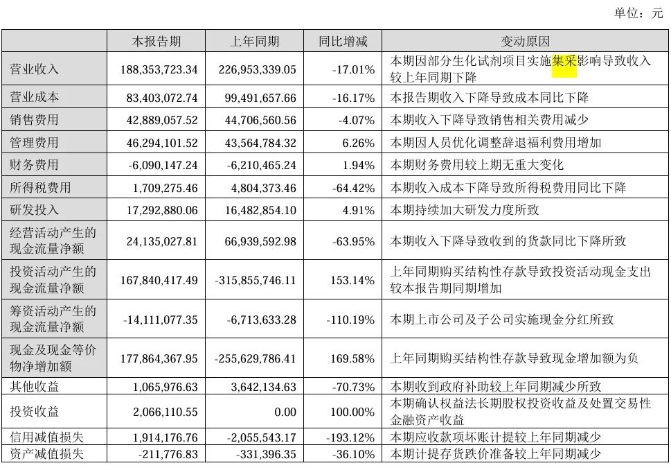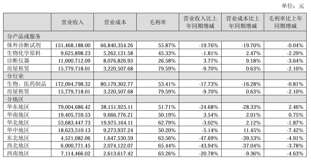 | 利德曼发布2024年半年度报告,该公司营业收入为1.88亿元,同比减少17.01%。归属于上市公司股东的净利润为60.61万元,同比减少96.32%。归属于上市公司股东的扣除非经常性损益的净亏损为361.89万元。基本每股收益为0.0011元。 公司营业收入和净利润下降主要原因:相较于上年同期,本期终端医院回归以常规检测项目为主;受部分生化诊断试剂集采等影响,公司纳入集采范围的试剂产品销售价格和毛利率同比下降。 报告期末,公司总资产为 189,577.60 万元,比年初减少2.20%;归属于上市公司股东的净资产为 173,780.80 万元, 比年初减少0.28%。 体外诊断试剂业务是公司营业收入的主要来源,实现收入15,146.82万元,同比下降19.76%,占营业 收入比重的80.42%; 诊断仪器(含配件及耗材)业务实现收入 1,100.07万元,同比增长 3.77%,占营业收入比重的 5.84%; 生物化学原料业务实现收入962.59万元,同比下降1.81%,占营业收入比重的5.11%; 其他业务(主要为房屋租赁和物业管理)实现收入1,625.89万元,同比下降8.52%,占营业收入比重的8.63%。 主营业务分析 (图源:企业公告) 信息来源:利德曼公告,医业观察 |