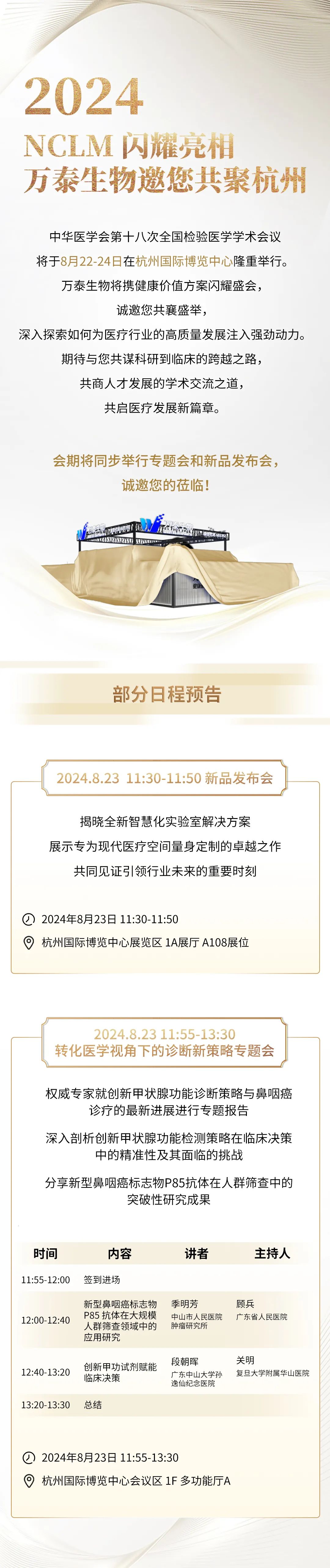 携手共进,点亮医疗创新之光 在医疗健康领域,每一次创新都是对生命质量的深刻提升。万泰生物,作为体外诊断行业的先行者,我们深知肩负的责任与使命。随着2024年全国临床检验医学大会(NCLM)的临近,我们满怀激情地准备着一场关于健康价值方案的盛会。 本次大会,万泰生物将携其创新的健康价值方案,与业界同仁共同探讨如何为医疗行业的高质量发展注入强劲动力。我们诚邀您加入这场思想与智慧的交流,深入探索科研到临床的跨越之路,共商人才发展的学术交流之道,共同开启医疗发展的新篇章。 我们相信,通过我们的共同努力,可以为医疗行业带来更多创新的解决方案,为患者带来更精准的诊断和更有效的治疗方案。让我们在杭州这座美丽的城市相聚,共同见证并参与这一行业盛事。 |