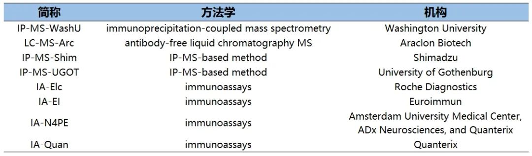 使用多种方法测量血浆和CSF中Aβ42和Aβ40的浓度,包括华盛顿大学开发的免疫沉淀-质谱法(IP-MS-WashU)、Araclon开发的无抗体液相色谱-质谱法(LC-MS-Arc)、罗氏诊断的免疫测定法(IA-Elc)、Euroimmun的免疫测定法(IA-EI)、阿姆斯特丹大学医学中心等开发的N4PE Simoa免疫测定法(IA-N4PE)、岛津开发的基于IP-MS的方法(IP-MS-Shim)、哥德堡大学开发的基于IP-MS的方法(IP-MS-UGOT)以及Quanterix的另一种Simoa免疫测定法(IA-Quan)。 主要结果是评价使用8种不同的检测方法量化的血浆Aβ42/40对CSF Aβ42/40和Aβ-PET状态异常的鉴别准确性。