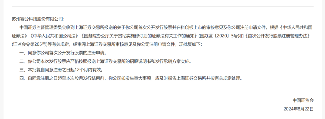 证监会官网8月23日显示,苏州赛分科技股份有限公司IPO注册正式生效,即将敲钟上市。 赛分科技于2022年12月30日申请科创板IPO,2024年1月11日过会,2024年8月9日提交注册,2024年8月23日获得证监会注册批文。其是上交所今年首家审核企业,也是年内科创板IPO首家过会企业。过去2年,有无数家企业成功过会但都被终止注册,赛分科技的同意注册太不容易了。赛分科技有限公司(Sepax Technologies, Inc.)于2002年在美国特拉华州成立,致力于开发和生产用于生物大分子等药物分离纯化的液相色谱材料。历经二十年在色谱层析领域的深耕,赛分科技已发展成为一个集研发、生产和全球销售为一体的实业型企业,全球客户超5000家。公司主要产品为色谱层析介质、液相色谱柱,为全球生物制药企业提供从药品研发、临床前(Pre-IND)到临床Ⅰ、Ⅱ、Ⅲ期、生产以及质控全周期全流程分析色谱和工业纯化解决方案。苏州赛分科技成立于2009年3月16日,主要从事药物分析检测和分离纯化的液相色谱材料研发和生产。公司核心产品为应用于生物大分子药物及小分子化学药物分析检测和分离纯化的色谱柱和层析介质,贯穿药物开发生产的全过程,应用于药物研发、IND申报、临床试验、申请上市、商业化生产等多个环节。简单说来,赛分科技主要是生产高分辨率及高效的生物分离和提纯产品,而这其中最大的一块市场便是生物药的分离和提纯。据前瞻产业研究院数据,2021年中国色谱柱产量达到17.2万根,占全球色谱柱产量比例为4.2%。赛分科技2021年分析色谱柱产量大约在1.72万根左右,占到国内产量的约10%。赛分科技的客户群体非常广泛,其在全球分析色谱领域客户超过5000家,与包括罗氏、辉瑞、礼来、甘李药业、正大天晴、齐鲁制药、再生元、Moderna等国际大型医药集团、生物制药公司以及创新药企业建立了业务合作关系,并与Agilent、Sigma-Aldrich等行业国际巨头保持长期稳定合作。但是从收入和利润的规模来说,赛分科技的体量并不大,从2021年到2023年上半年,其收入分别为1.55亿、2.13亿和1.34亿,净利润分别为0.22亿、0.48亿和0.35亿。招股书显示,从2021年至2022年,赛分科技的生物大分子层析介质的产能利用率分别为89.83%、25.43%和35%,波动幅度较大。硅胶基质填料的产能利用率也并不稳定,分别为71.96%、99.25%和63.66%。相比之下,分析色谱柱产能利用率虽未饱和,但相对稳定,报告期内分别为95.63%、89.66%、80.24%、79.14%,基本在80%以上。据赛分科技招股书显示,此次在科创板上市,赛分科技计划募资8亿元。其中,3.34亿元用于20万升/年生物医药分离纯化用辅料,1.95亿元用于研发中心建设项目,2.7亿元用于补充流动资金。