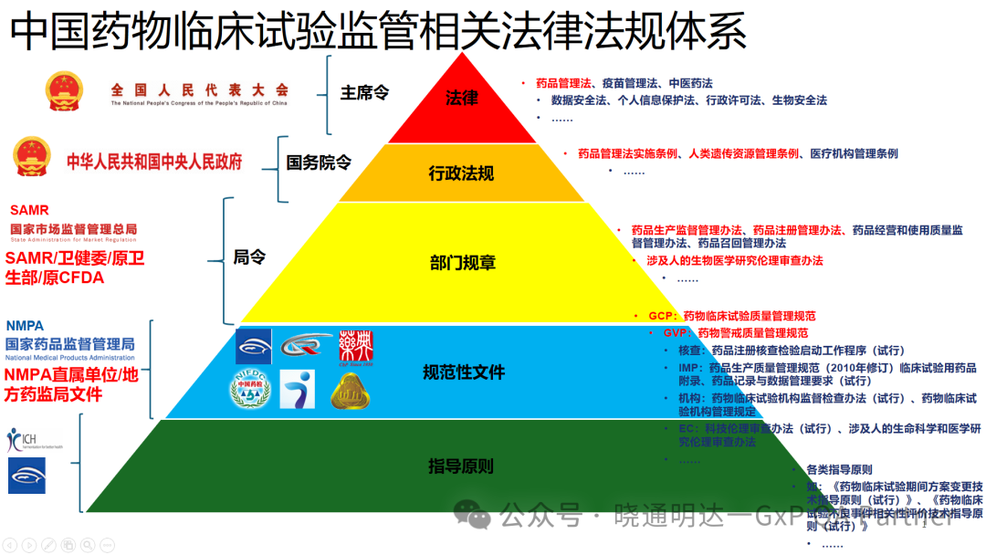 药物临床试验是新药研发过程中的关键环节,旨在评估药物的安全性、有效性及确定其适用范围。在全球范围内,药物临床试验受到严格监管,确保研究符合伦理标准,保护受试者权益,并保证数据的真实性和可靠性。同样在中国,药物临床试验受到一系列复杂而全面的法规体系的监管,这一体系包括不同层次的法律、行政法规、部门规章、规范性文件和技术性指导原则。 本文将按法律位阶,概述这些法规的名称、发布机构和常见法规,以提供对药物临床试验法规体系的全面理解。