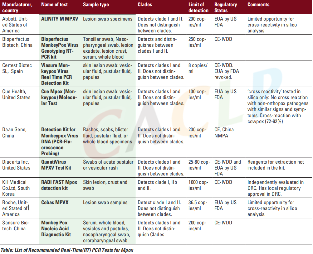 2024年8月13日,非洲疾病预防控制中心(Africa CDC)宣布猴痘疫情为威胁非洲大陆安全的“公共卫生紧急事件”(PHECS)。8月15日,世界卫生组织(WHO)将警报级别提升至“国际关注的突发公共卫生事件”(PHEIC),标志着全球对猴痘疫情的高度关注。 为了加强疫情的应对措施,非洲疾病预防控制中心诊断咨询委员会(DAC)于2024年8月19日至23日在基加利召开紧急会议,审查并筛选出首批推荐的猴痘分子诊断试剂。这一推荐旨在指导采购决策,确保各国能够采用高质量的分子检测方法,有效应对猴痘疫情的挑战。经过评估和审查9家体外诊断企业猴痘检测试剂入选首批推荐名单 ,企业包括罗氏、雅培、圣湘生物、达安基因、硕世生物、DiaCarta、Cue Health、Certest Biotec、KH Medical 。非洲疾病预防控制中心和世界卫生组织呼吁所有国家加强对猴痘疫情的监测和应对措施,同时强调了采用经过验证的检测方法的重要性。