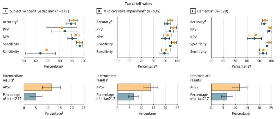 在初级和二级保健诊所中,阿尔茨海默病血液生物标志物最有希望的是血浆p-tau217,和p-tau217的百分比,Aβ42:Aβ40血浆比值。p-tau217与Aβ42:Aβ40血浆比值联用时,可提高诊断准确性。这些生物标志物必须在初级保健中进行验证,并在诊断准确性方面与标准的临床评估进行比较。 近日,医学期刊JAMA(IF 63)上发表了一篇题为“Blood Biomarkers to Detect Alzheimer Disease in Primary Care and Secondary Care”的文章。研究团队利用预先定义的生物标志物cutoff值,对初级保健和二级保健中临床可用的阿尔茨海默病血液检测方法,p-tau217的百分比,以及APS2(Aβ42:Aβ40血浆比值)进行前瞻性评价。结果发现使用APS2和p-tau217百分比对识别有认知症状的个体具有明显更高的诊断准确性。未来的研究应该评估这些生物标志物的血液检测如何影响临床护理。 图片来源:JAMA 主要内容 参与者和生物标志物特征 有1213名有认知症状患者(515名来自初级保健,698名来自二级保健)参与了该研究。平均年龄为74.2岁,48%为女性。初级保健和二级保健队列AD病理患病率没有差异(初级为49.9%,二级保健队列中为49.7%)。 二级保健队列中 单独APS2 vs P-Tau217的诊断性能 当预定义的单一截止值应用于二级保健队列,APS2的诊断准确率为88%,而p-tau217的诊断准确率为91%。当使用APS2时,阳性预测值为88%,阴性预测值为87%,AUC为0.96。当单独使用p-tau217的百分比时,阳性预测值为89%,阴性预测值为92%,AUC为0.97(图1A)。 采用双截止值法,使用APS2的诊断准确率为93%,阳性预测值为97%,阴性预测值为89%;12%的结果位于两个截止值之间。当单独使用p-tau217的百分比时,诊断准确率为93%,阳性预测值为96%,阴性预测值为90%;6%的结果位于中间区(图2A)。 单cutoff值下,不同队列中APS2 vs P-Tau217的诊断性能。 图片来源:JAMA 初级保健队列中APS2和P-Tau217的诊断性能 当将预定义的单一截止值应用于初级保健队列时,APS2的诊断准确率为92%,而单独使用p-tau217的百分比的诊断准确率为88%。当使用APS2时,阳性预测值为91%,阴性预测值为92%,AUC为0.97。当单独使用p-tau217的百分比时,阳性预测值为86%,阴性预测值为92%,AUC为0.96(上图1B)。 采用双截止值方法,使用APS2的诊断准确率为95% ,阳性预测值为98%,阴性预测值为93%;15%的结果处于两个截止值之间。当单独使用p-tau217的百分比时,诊断准确率为91%,阳性预测值为97%,阴性预测值为86%;8%的结果位于中间区(图2B)。 双cutoff值下,不同队列中APS2 vs P-Tau217的诊断性能。 图片来源:JAMA 前瞻性分析,APS2与P-Tau217 在初级和二级保健队列中的诊断性能 当单个截止值应用于二级保健队列前瞻性和持续分析时,APS2的诊断准确率为91%,而单独使用p-tau217的诊断准确率为90%。当使用APS2时,阳性预测值为91%,阴性预测值为91%,AUC为0.97。当单独使用p-tau217的百分比时,阳性预测值为86%,阴性预测值为96%,AUC为0.97(上图1C)。 当单个截止值应用于初级保健队列时,使用APS2时,诊断准确率为89%,阳性预测值为88%,阴性预测值为90%,AUC为0.96。当单独使用p-tau217的百分比时,诊断准确率为90%,阳性预测值为86%,阴性预测值为94%,AUC为0.96(上图1D)。 当在二级保健队列中使用双截止值方法时,APS2的诊断准确率为94%,阳性预测值为96%,阴性预测值为91%;11%的结果处于2个截止值之间。当单独使用p-tau217的百分比时,诊断准确率为93%,且为阳性预测值为94%,阴性预测值为91%;6%的结果位于中间区(上图2C)。 当在初级保健队列中使用双截止值方法时,APS2诊断准确率为93%,阳性预测值为95%,阴性预测值为92%;13%的结果位于两个截止值之间。当单独使用p-tau217的百分比时,诊断准确率为91%,阳性预测值为92%,阴性预测值为90%;4%的结果位于中间区(上图2D)。 血液生物标志物性能与标准临床评价的比较 标准临床评估(没有使用生物标志物数据)二级保健队列前瞻性分析中,阿尔茨海默病病理作为结果时,痴呆专家总体诊断准确率为71%,明显低于使用APS2(92%)和p-tau217的百分比(91%)(图3A)。 类似地,在初级保健队列中,初级保健医生准确性为58%,显著低于前瞻性检测APS2(89%)和p-tau217的百分比(90%)的诊断准确性(图3B)。 比较医生的诊断性能和血液测试。图片来源:JAMA 不同认知严重程度阶段的诊断准确性 评估不同认知严重程度阶段(主观认知下降、轻度认知障碍和痴呆)的AD诊断准确性,来自二级保健队列和初级保健队列数据进行汇总并分析(图4)。当应用双截止值时,诊断的准确性显著提高,这是由阳性预测值数量的增加所驱动的。 在汇总数据中进行不同认知阶段的血液测试。 图片来源:JAMA 总结与讨论 在这项研究中,作者证明了在初级和二级保健诊所中应用预定义的血液生物标志物cutoff值p-tau217和Aβ42:Aβ40比率(APS2)导至高诊断准确性,阳性预测值和阴性预测值,且检测性能稳定。重要的是,尽管有相对较高的医学共病率,包括肾病(在初级保健队列中为26%),但血液检测仍然表现准确。 血液检测的诊断准确性较高,表明它可能适合在初级保健中实施,但未来的研究需要检验其对临床护理的影响。在二级保健队列中,血液检测的诊断准确性与FDA批准的脑脊液生物标志物相当,且更及时、更经济、更方便,有潜力取代脑脊液检测和PET。 在当前的分析中,APS2和p-tau217百分比都显示出了稳健的测试性能。在二级保健和初级保健队列中,这些生物标志物结果非常相似。在主观认知下降或轻度认知障碍患者中,APS2使用双截止值显示出更高的诊断准确性,但会导至更